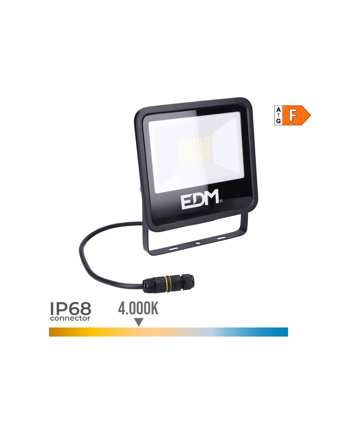 Foco proyector led 50 w 4000 lm 4000 k luz día ip65 70 leds 19,2 x 2,9 x 17,5 cm vida estimada: 25000 h tensión: 220 - 240 v ~ 50 hz clase energética: f ángulo de apertura: 120°. incluye conector de cables estanco ip68. black series