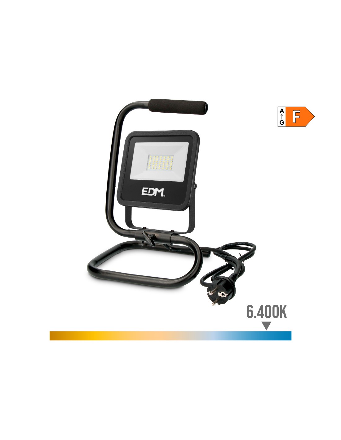 Foco proyector led con pie 30 w 2370 lm 6400 k luz fría ip65 42 leds 22 x 21 x 32 cm vida estimada: 25000 h tensión: 220 - 240 v ~ 50 hz clase energética: f ángulo de apertura: 120°. incluye clavija schuko con cable de 1,5 m. black series