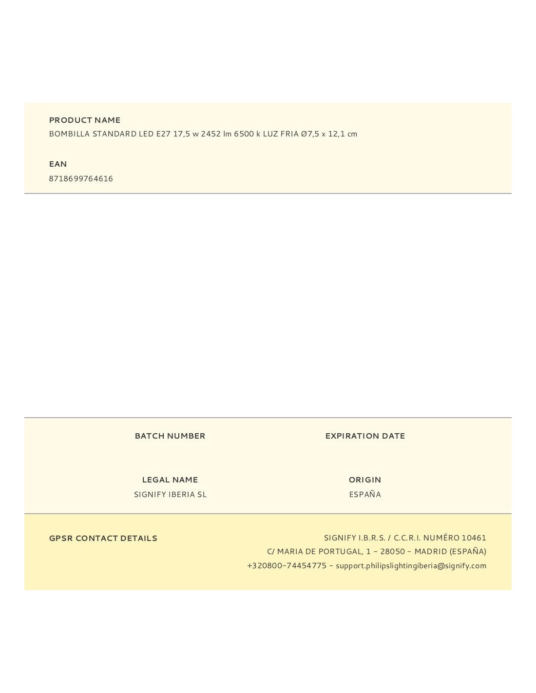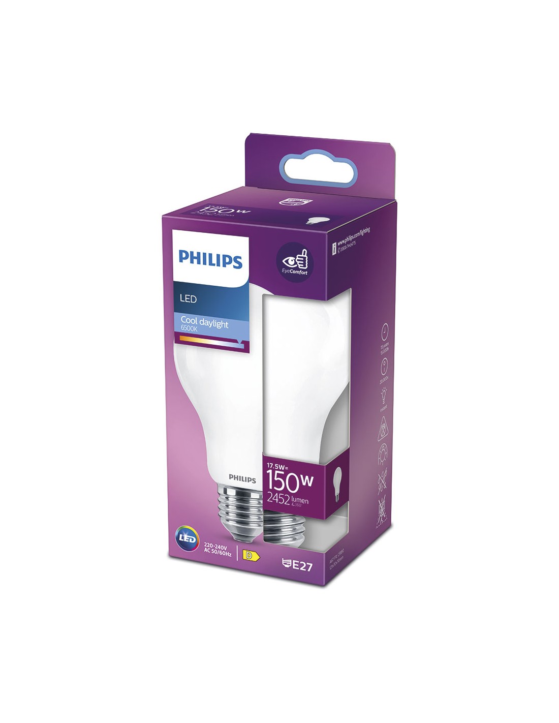Bombilla standard led e27 17,5w 2452lm 6500k luz fria. medida: ø7,5x12,1cm (diámetro/alto) 15000h. ac 220-240v cristal mate, no regulable, irc:80 angulo de apertura 360°. equivalencia: 150w. philips