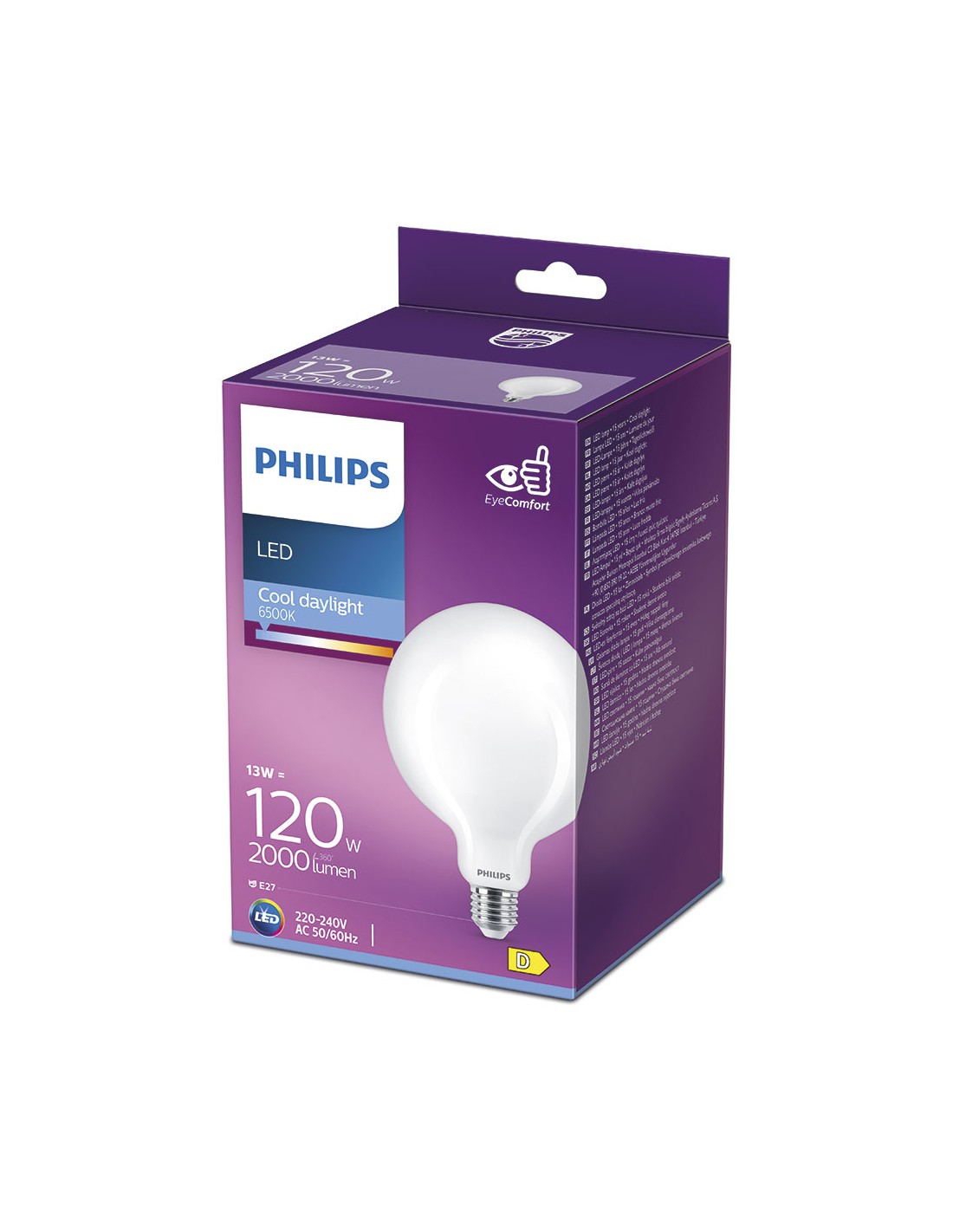 Bombilla globo led e27 13w 2000lm 6500k luz fría. medida: ø12,4x17,7cm (diametro/altura). 15000h, ac 220-240v. . cristal mate. no regulable. irc:80. angulo de apertura 360°. equivalencia: 120w. philips