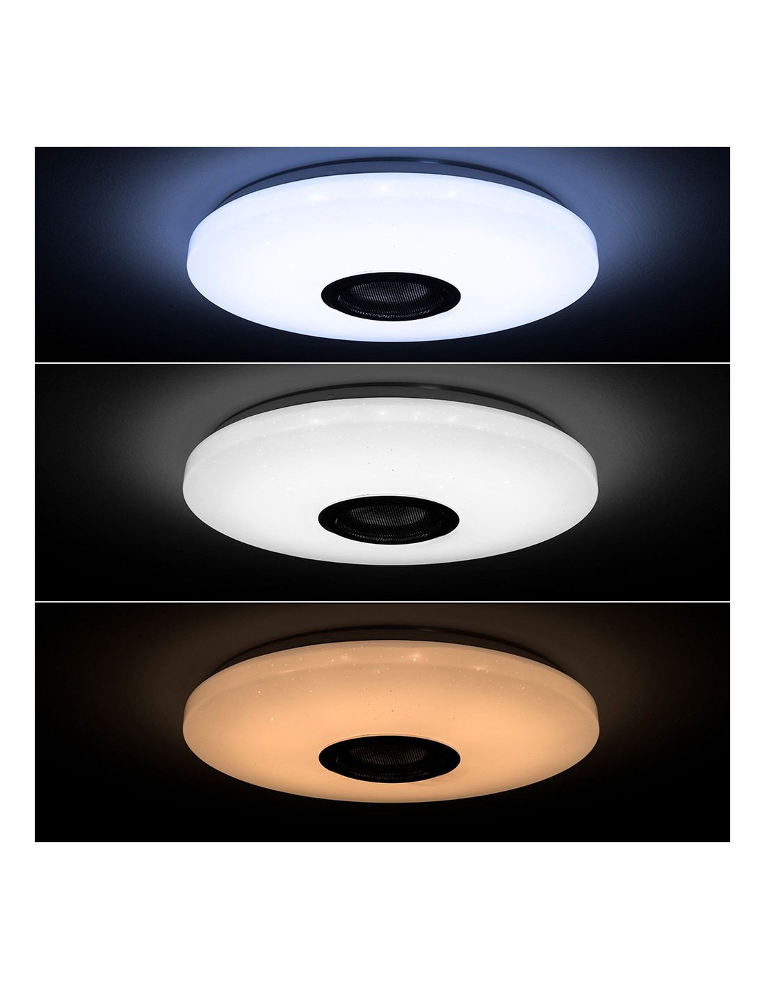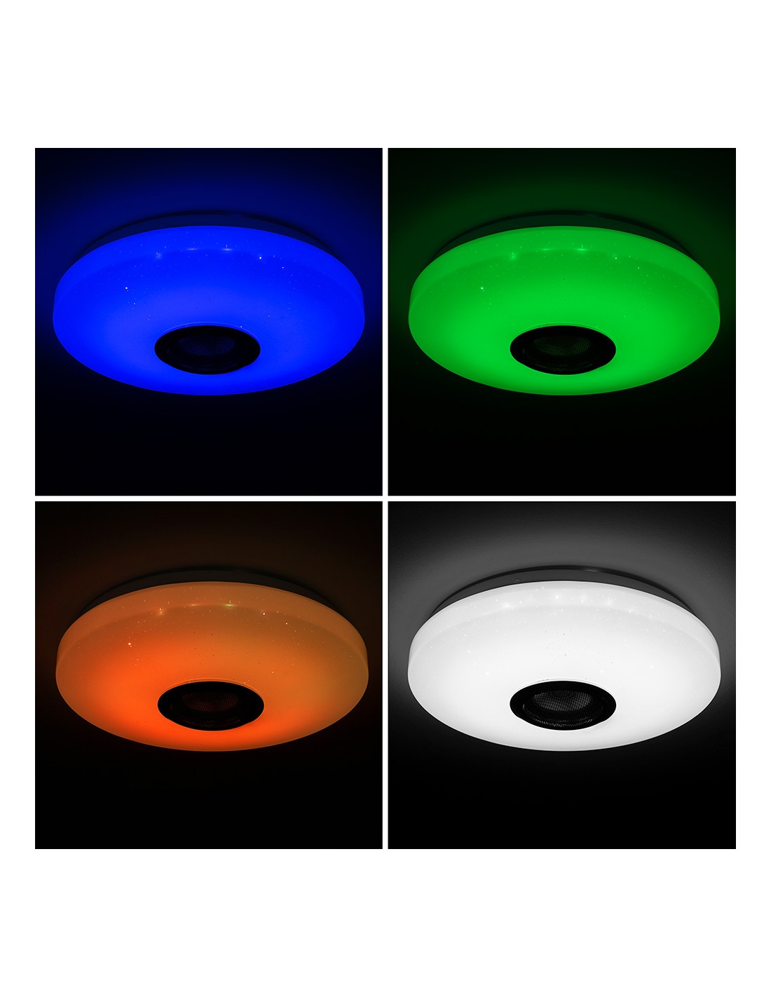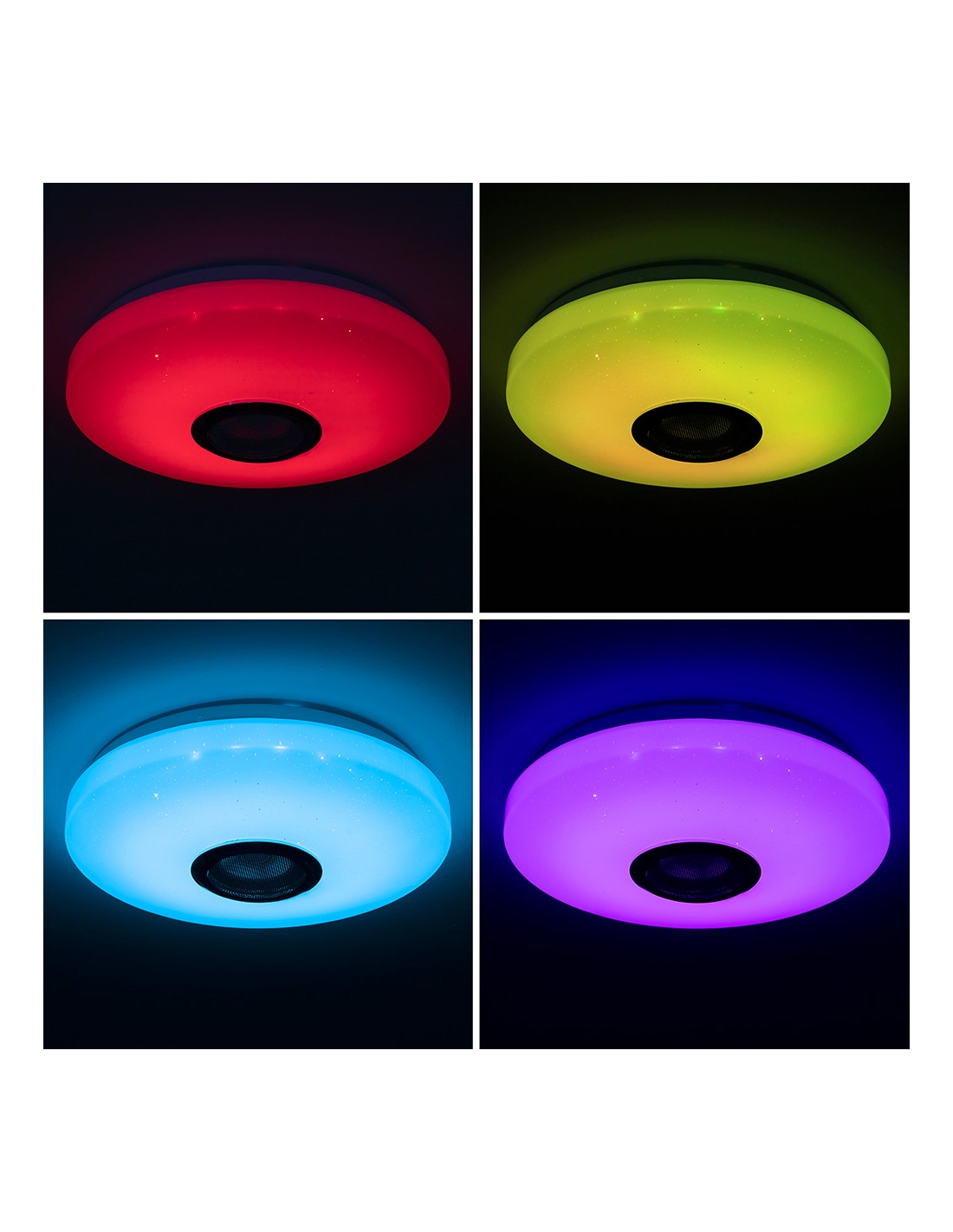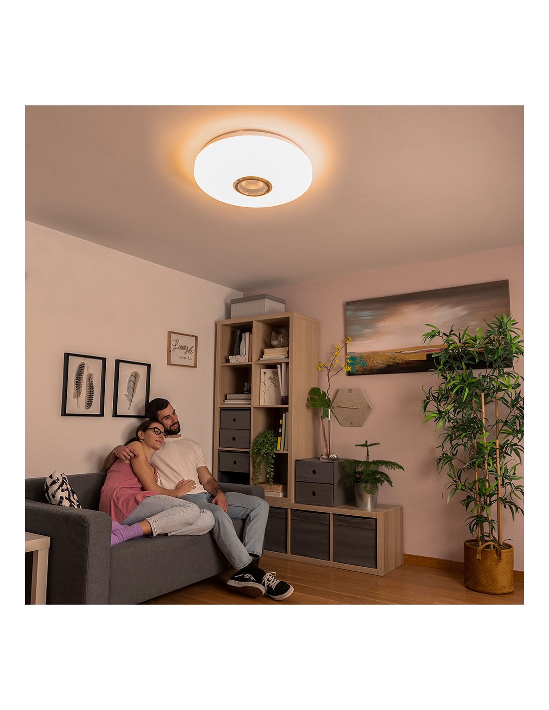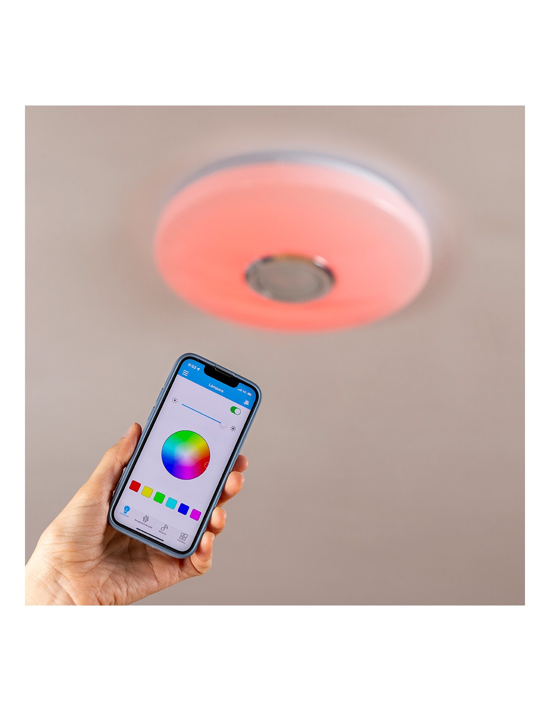 Lámpara led de techo con altavoz lumavox v0103688 innovagoods lámpara de techo tipo plafón, con luz led y altavoz integrado. multifunción bluetooth 5.2. varios tipos de iluminación e intensidad multicolor (rgb). con control remoto, con app o mando. pantalla de pvc efecto hielo. luz led 30-16w/2800-1350 lumens altavoz 5w. medidas: ø29x7cm (diámetro/alto)