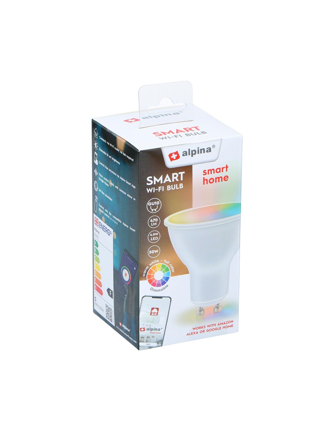 Bombilla inteligente rgb+gu10 4.9w alpina. 5x5,8cm 470lm 2700-6500k wifi. para más información, consulte el manual de instrucciones.