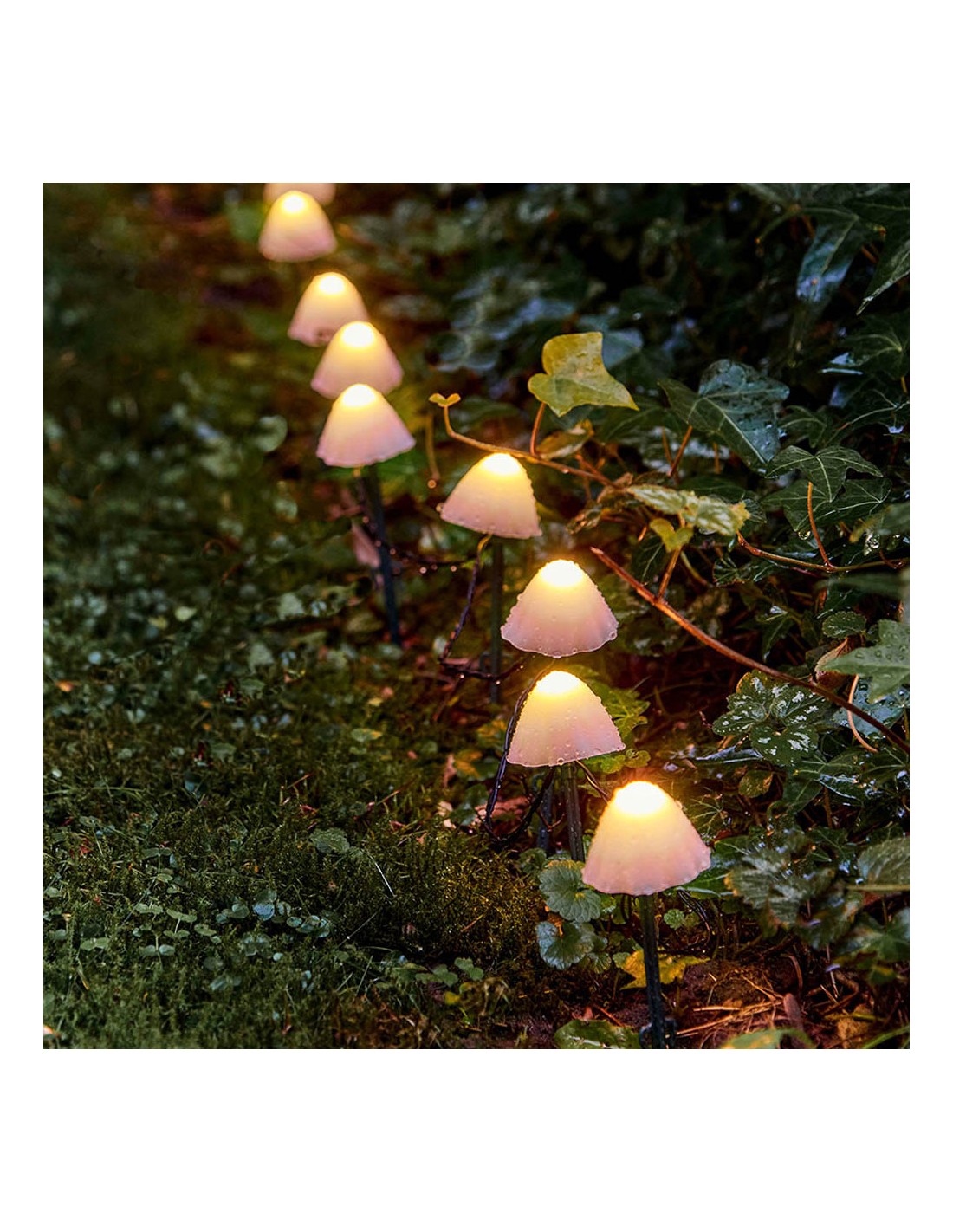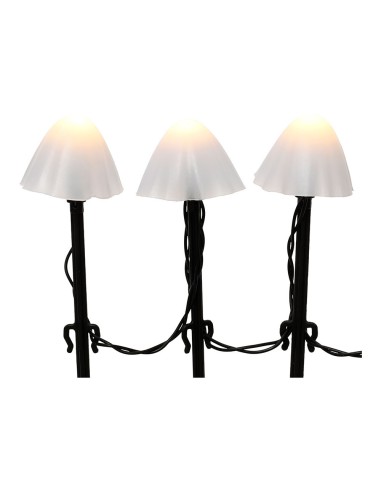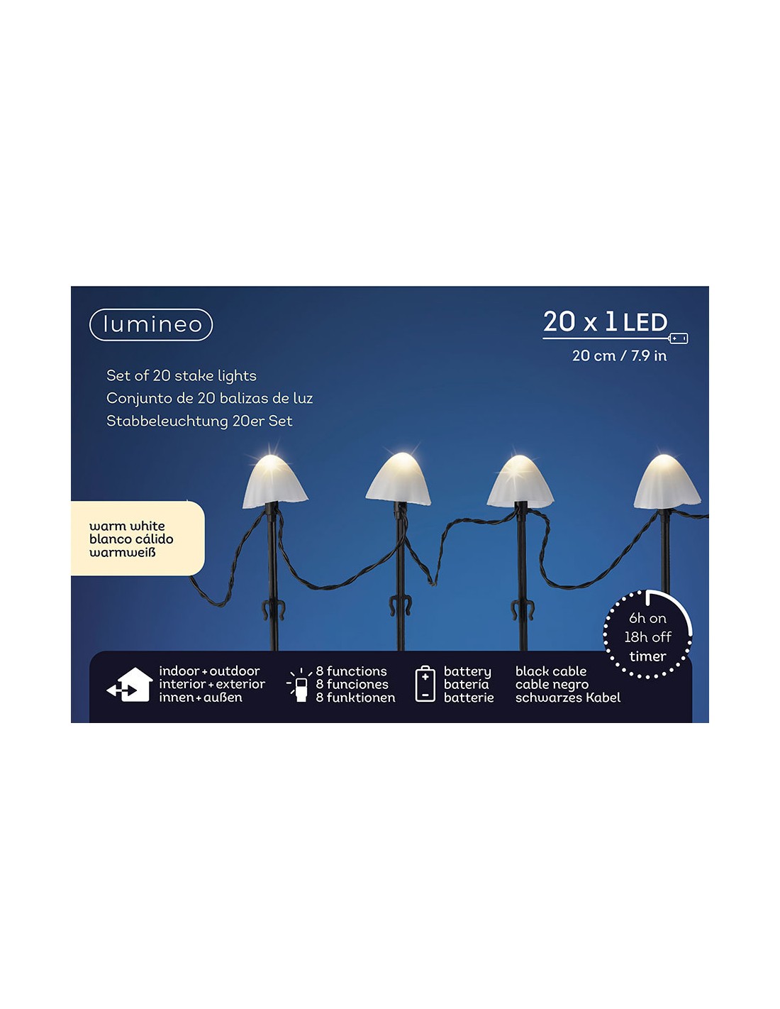 Estaca led con forma de seta con 8 funciones para exterior 491762 juego de 20 unidades con pinzas. cable de color negro , distancia entre estacas 20cm. 8 funciones de destello. color del led: blanco cálido. tamaño del led: 5mm. longitud del cable de conexión 30cm. número de baterías 3. número de bombillas 20. tipo de alimentación batería.temporizador: 6 horas. tipo de batería aa. horas de funcionamiento 48 horas