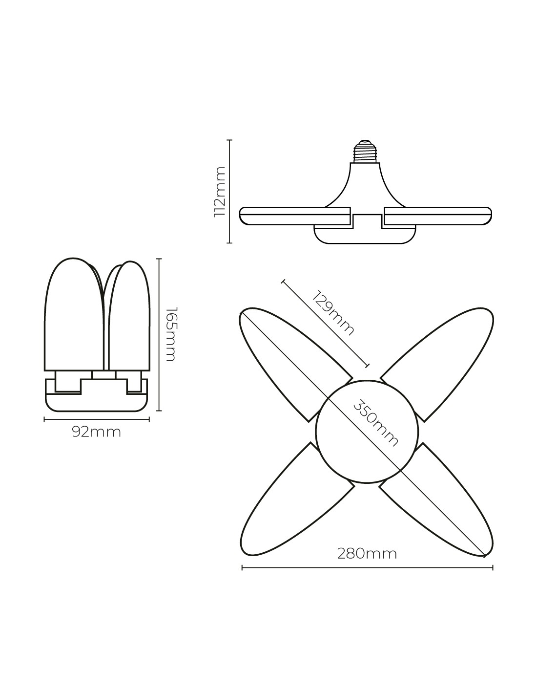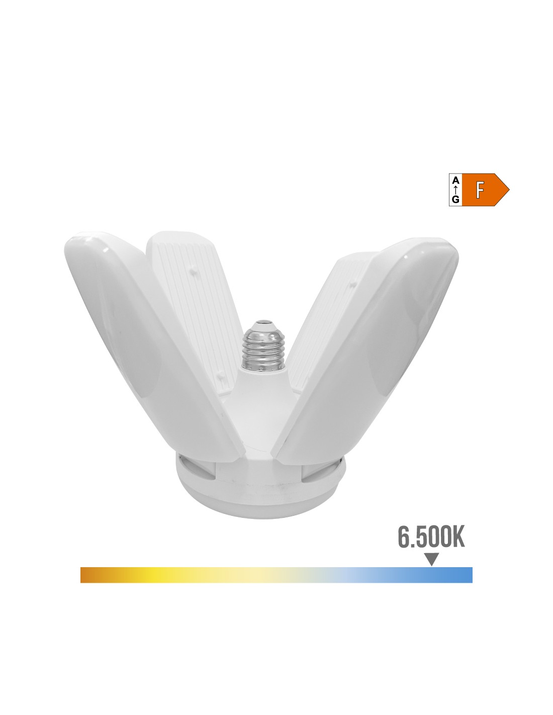Bombilla led multidireccional con casquilo e27, con potencia de 30 w, con una luminosidad de 3155 lm, luz fría con temperatura de 6.500 k, 144 led, grado de protección ip20. alas plegables multiposición, abatibles 90 °. medida abierta 350 mm de diámetro x 112 mm de altura. medida plegada 92 x 165 mm