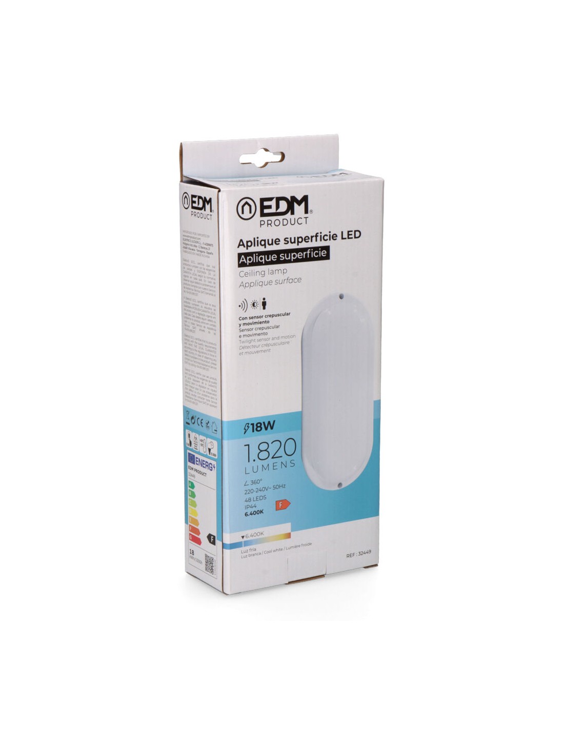 Aplique oval led con sensor crepuscular y movimiento 18w 1820lm 6.400k luz fría, 48 leds, no regulable, clase energetica f, ip44, medidas: 23x10,2x4,5cm. solo se activa en la oscuridad, vida estimada 25000h edm