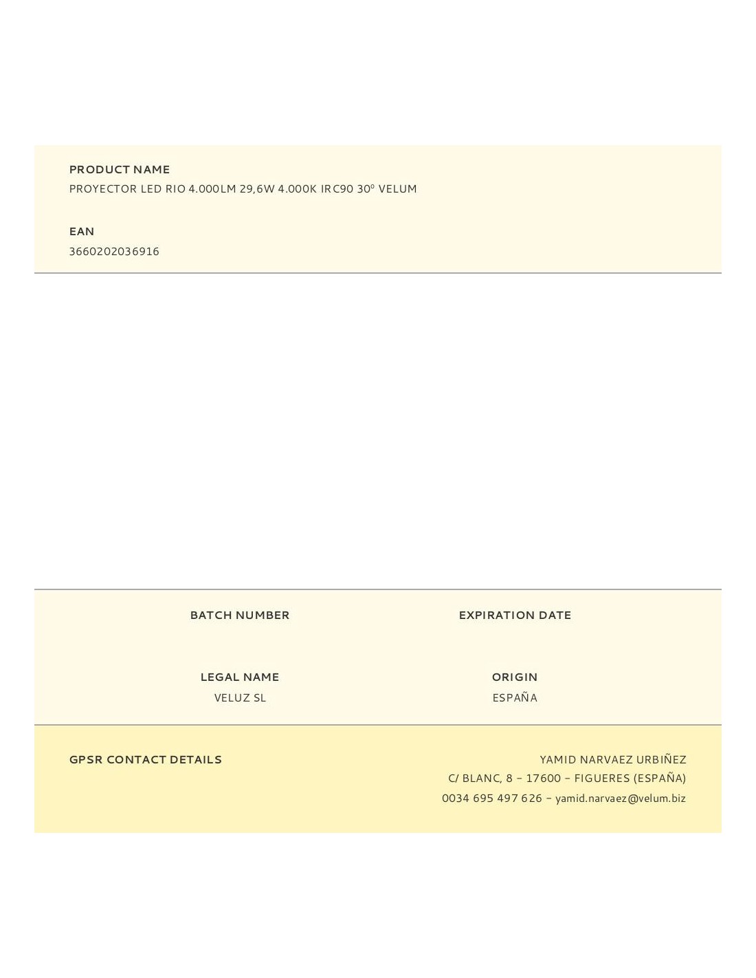 Proyector led rio 4.000lm 29,6w 4.000k irc90 30 velum 220-240ac, 50/60hz, clase energetica a++,irc 90,fabricada en aluminio, color del cuerpo negro ral9005g. atención esta proyector solamente puede ser instalada por un instalador profesional autorizado, en caso de dudas contactar con: yamid.narvaez@velum.biz