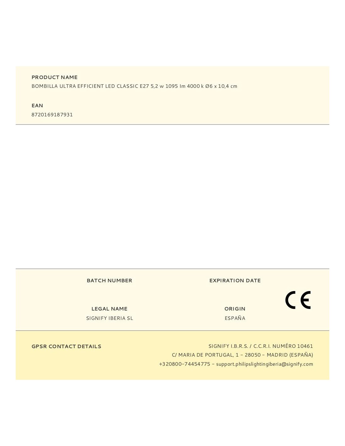Bombilla ultra efficient led classic a70 estandar 5,2w 1095im e27 mate 4000k, luz dia, 220 -240v ac 50/60hz, tipo de flujo 90°, ángulo de apertura 360°, equivalencia 75w, horas de funcionamiento 50.000h aprox. philips