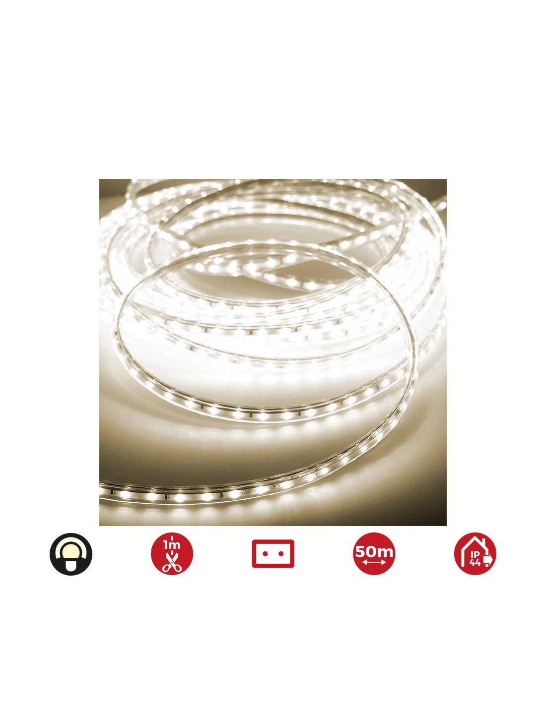 Tira de led 50m. 60 leds/m 4,2w/m blanco calido 3.200k ip44 edm 220-240v atencion cortar solamente por la marca de las tijeras cada 1m conexion maxima 100m (no conectar la bobina enrollada) 350 lm/m