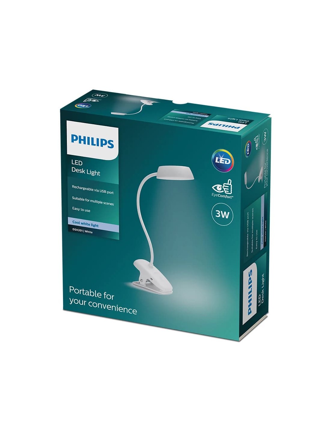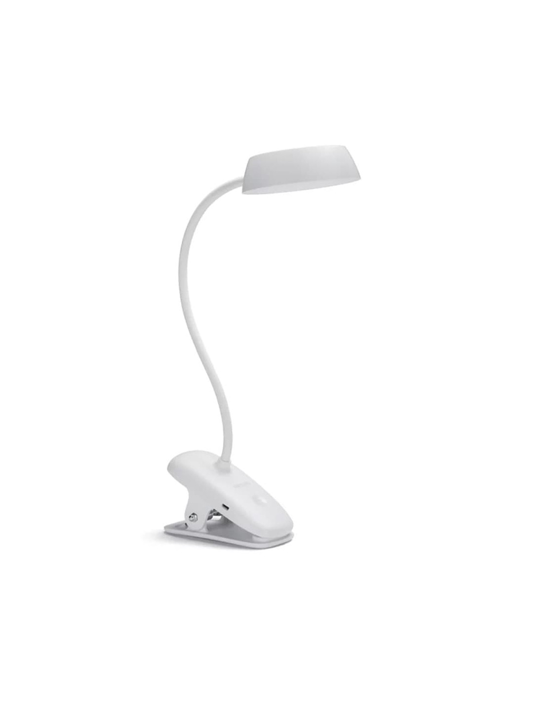 Flexo pinza, color blanco, led 3w 4.000k, 175 lm. una luz de lectura con clip, con batería de litio integrada de 1200 mah, incluye cable usb. fácil redirección de la luz con cuello de cisne, tecla táctil para atenuación de 3 niveles, distribución uniforme de la luz.