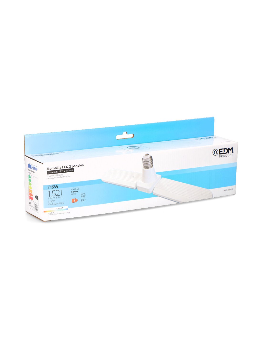 Bombilla 48 led en 2 paneles, e27, 15w, 1521lm, 6.500k luz fría , ip20, ra:80, 72ma, no regulable, angulo de luz 180 , vida estimada 25.000h, tensión 220-240v 50hz, medidas: 35,5 x 6,3 x 8,6 cm