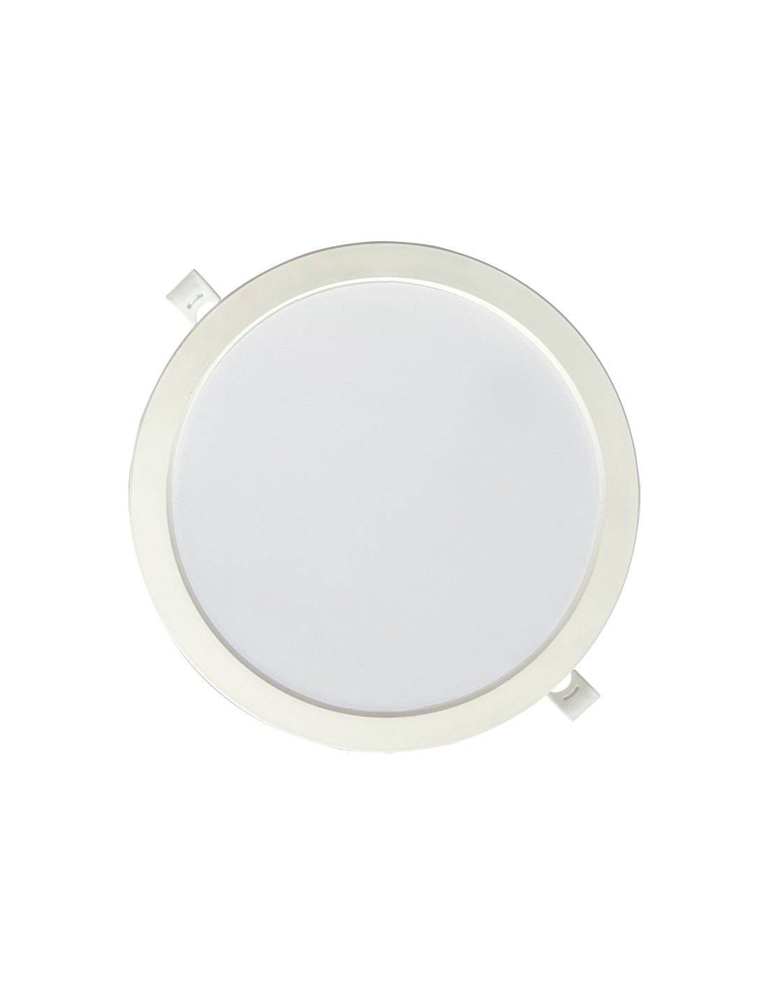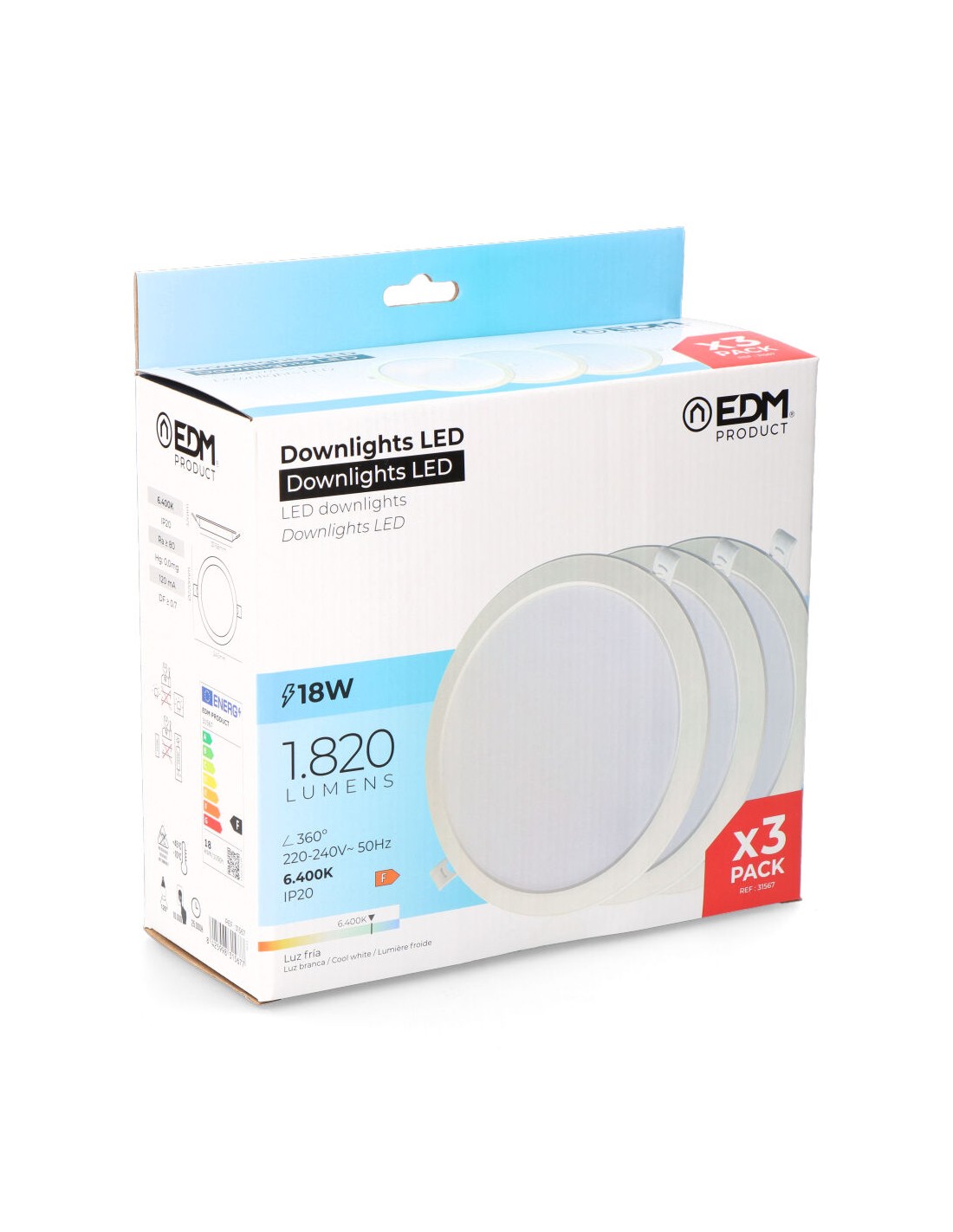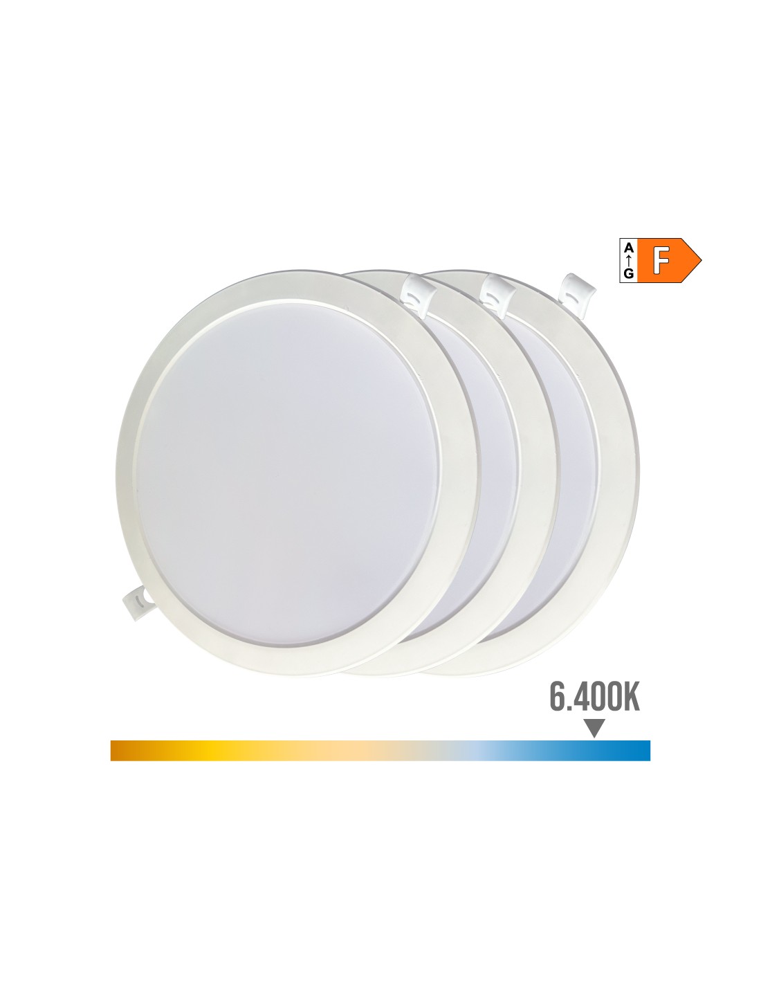 Pack 3 downlight led empotrables redondos. 18w, luz fría 6400k, 1820lm, dimensiones ø220 x 32 mm, medida empotrable ø185 cm, marco color blanco, ángulo de apertura 120°, flujo luminoso 360°. clase energética f, ip20, 220-240v-50hz. vida estimada 25.000h.