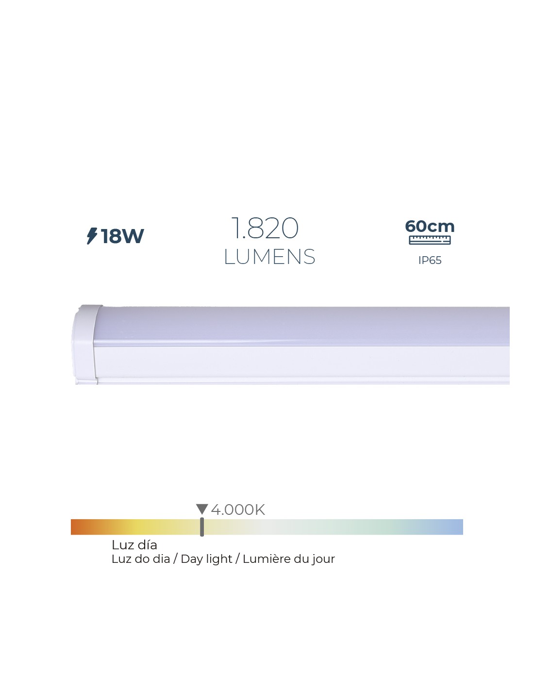 Regleta electrónica led 18 w 4000 k luz día ip65 96 leds,1.820 lm. no regulable, encendido rápido, sin parpadeo, angulo de luz 110°. no interconectables. ra80 115ma 220.240v-50hz. medidas: 60 x 4,6 x 5,1 cm. 25.000 h