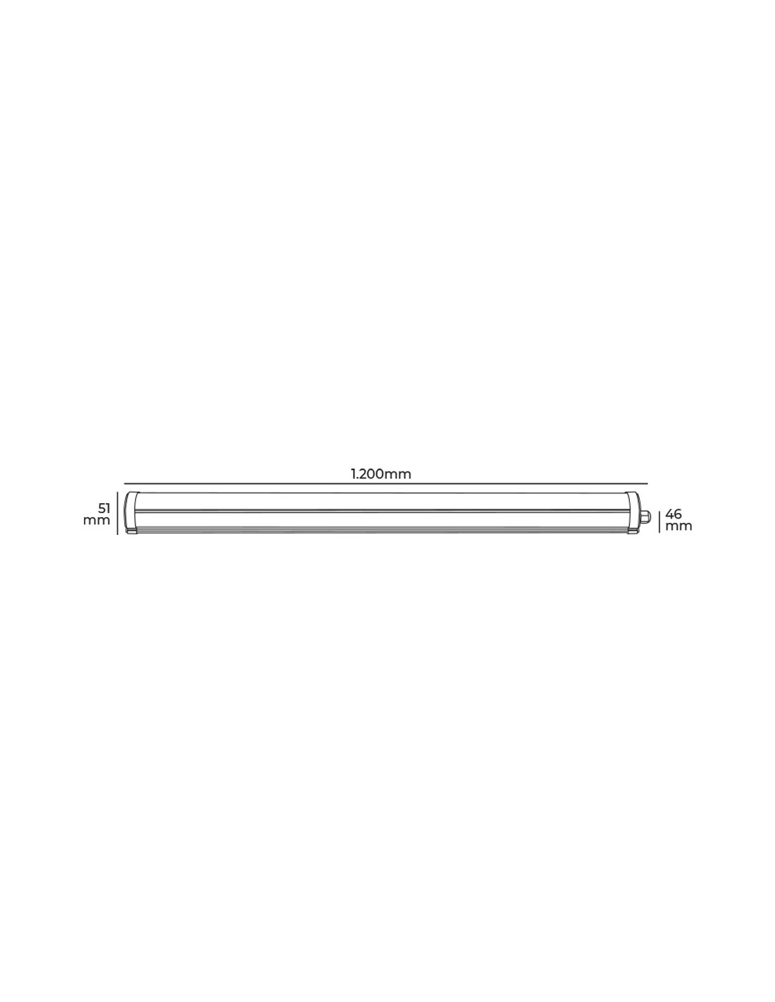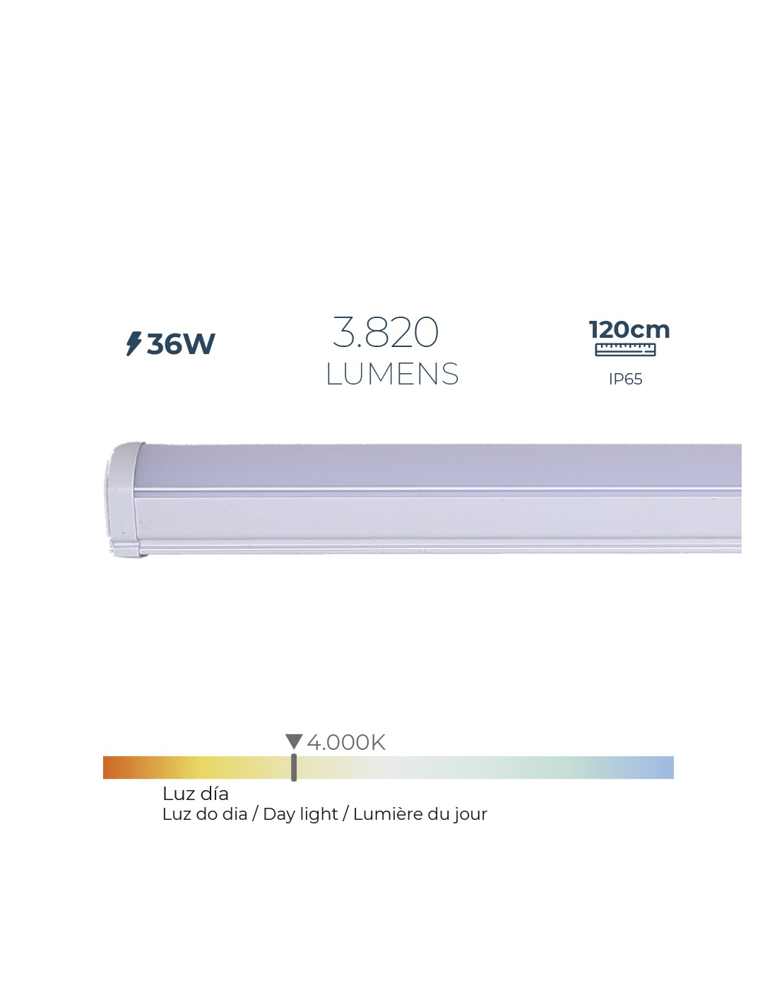 Regleta electrónica led 36 w 4.000 k luz día ip65 192 leds, 3.820 lm. no regulable, encendido rápido, sin parpadeo, angulo de luz 110°. no interconectables. ra80 115ma 220.240v-50hz. medidas: 120 x 4,6 x 5,1 cm. 25000 h