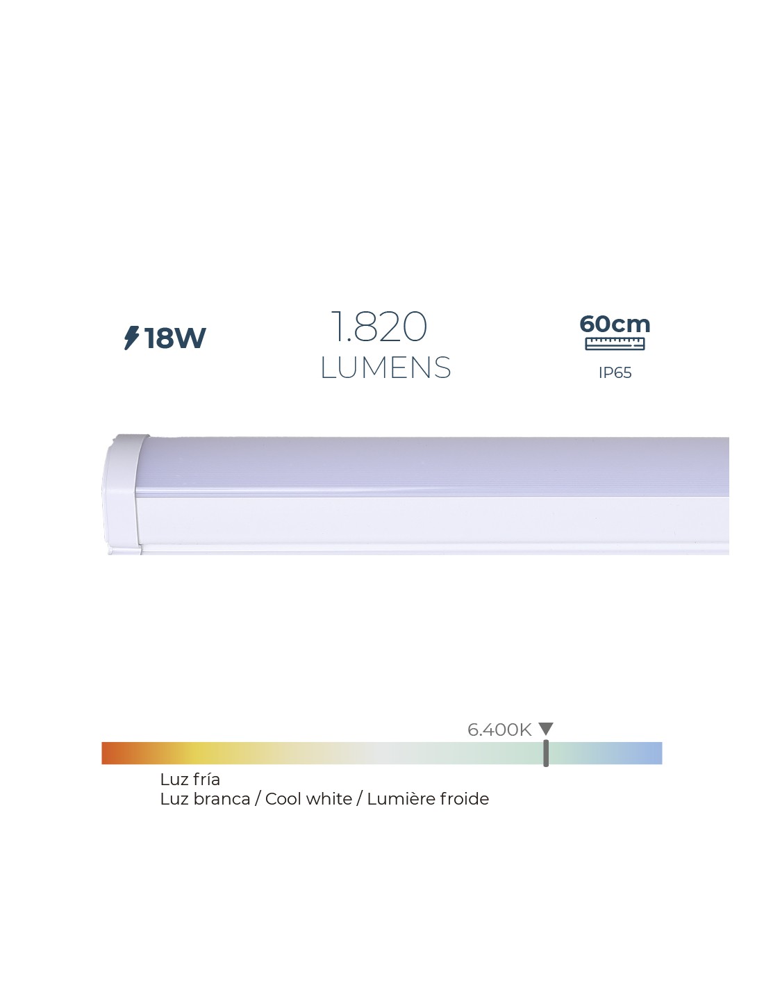 Regleta electrónica led 18 w 6.400 k luz fría ip65 96 leds,1.820 lm. no regulable, encendido rápido, sin parpadeo, angulo de luz 110°. no interconectables. ra80 115ma 220.240v-50hz. medidas: 60 x 4,6 x 5,1 cm. 25.000 h