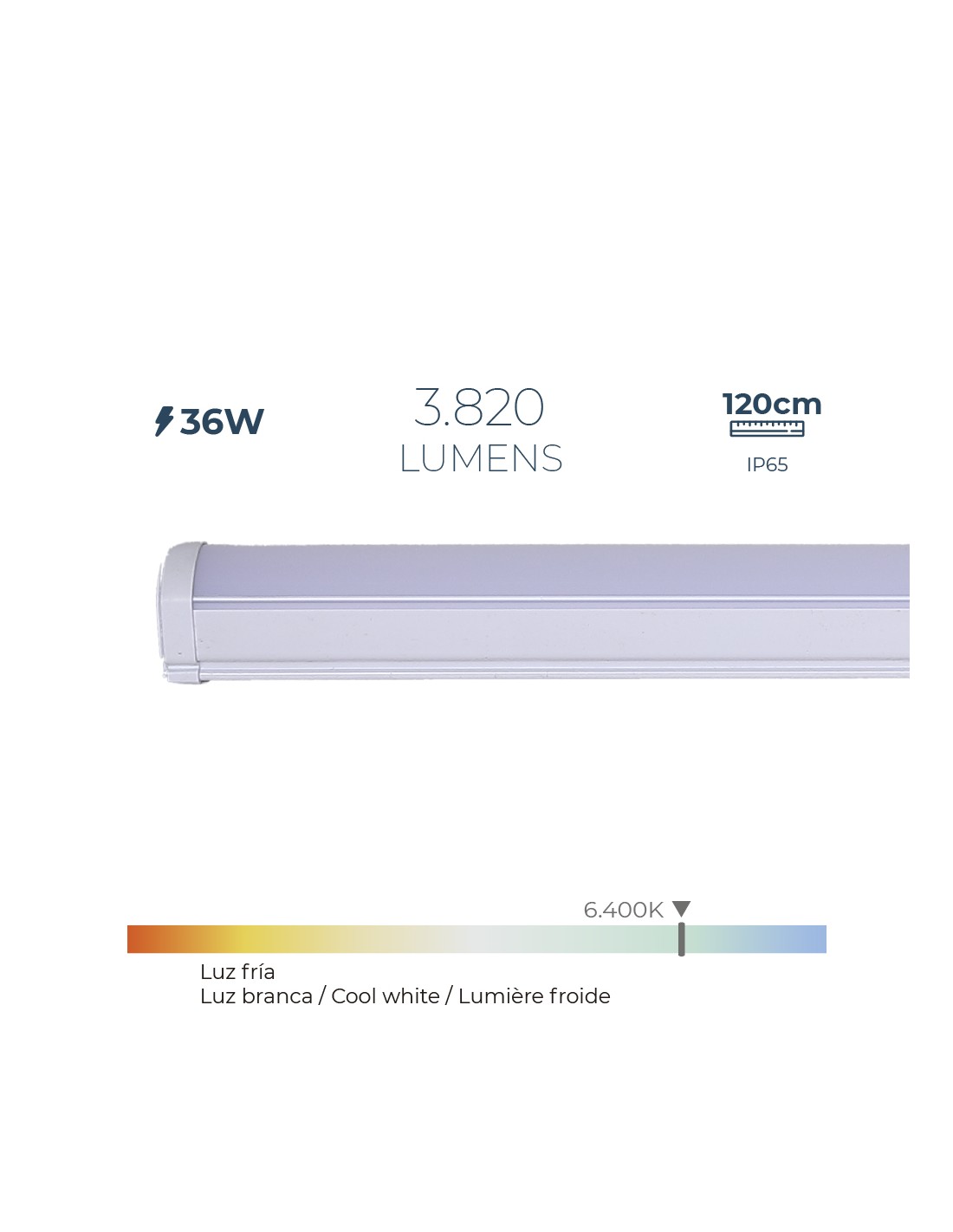 Regleta electrónica led 36 w 6.400 k luz fría ip65 192 leds, 3.820 lm. no regulable, encendido rápido, sin parpadeo, angulo de luz 110°. no interconectables. ra80 115ma 220.240v-50hz. medidas: 120 x 4,6 x 5,1 cm. 25.000 h