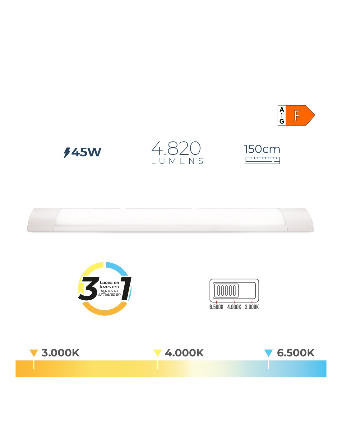 Regleta led 3 luces en 1. color blanca. temperatura de luz variable mediante selector 6500 k / 4000 k / 3000 k, 3cct, 20 w, 4820 lm. 384 leds. ip20, ra 80, 150ma. 220-240v-50hz. flujo luminoso 360°. ángulo apertura 180°. regulable, encendido rapido sin parpadeo. vida estimada 25000 h. energia f, medidas: 150 x 2,6 x 7,4 cm
