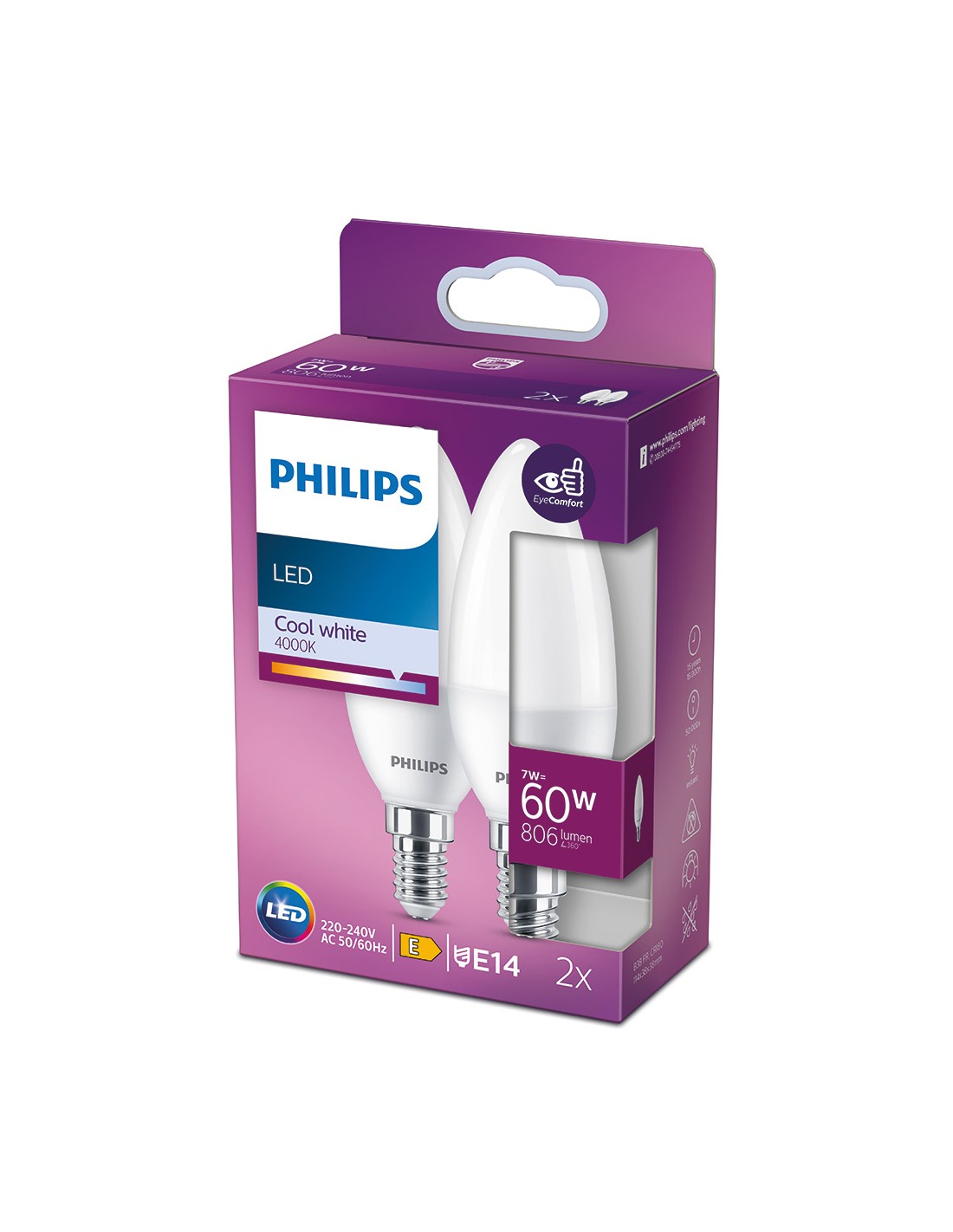 Bombilla vela led e14 7 w (equiv. 60 w) 806 lm 4000 k luz día, cri 80, clasificación energética e, vida útil: 15.000 h, 220 - 240 v ac 50/60 hz. flujo luminoso 360° dimensiones: ø3,8 x 11,4 cm. 2 uds