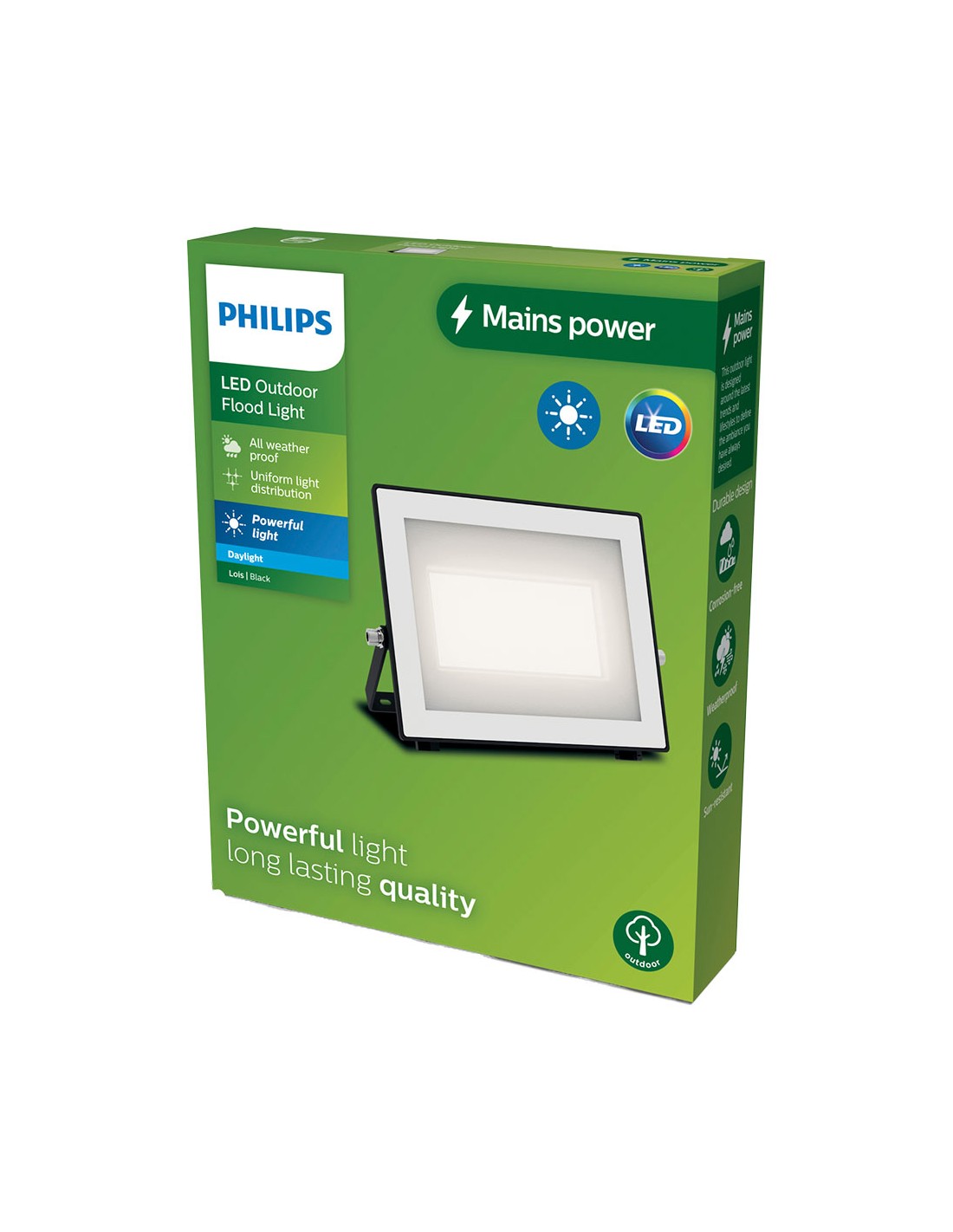 Proyector lois negro, luz día, 50 w, 5400 lm, flujo luminoso 360°, 5000 k, para exterior ip65, 220 - 240 v ~50/60 hz, vida estimada 15000 h, dimensiones 196 x 28 x 165 mm