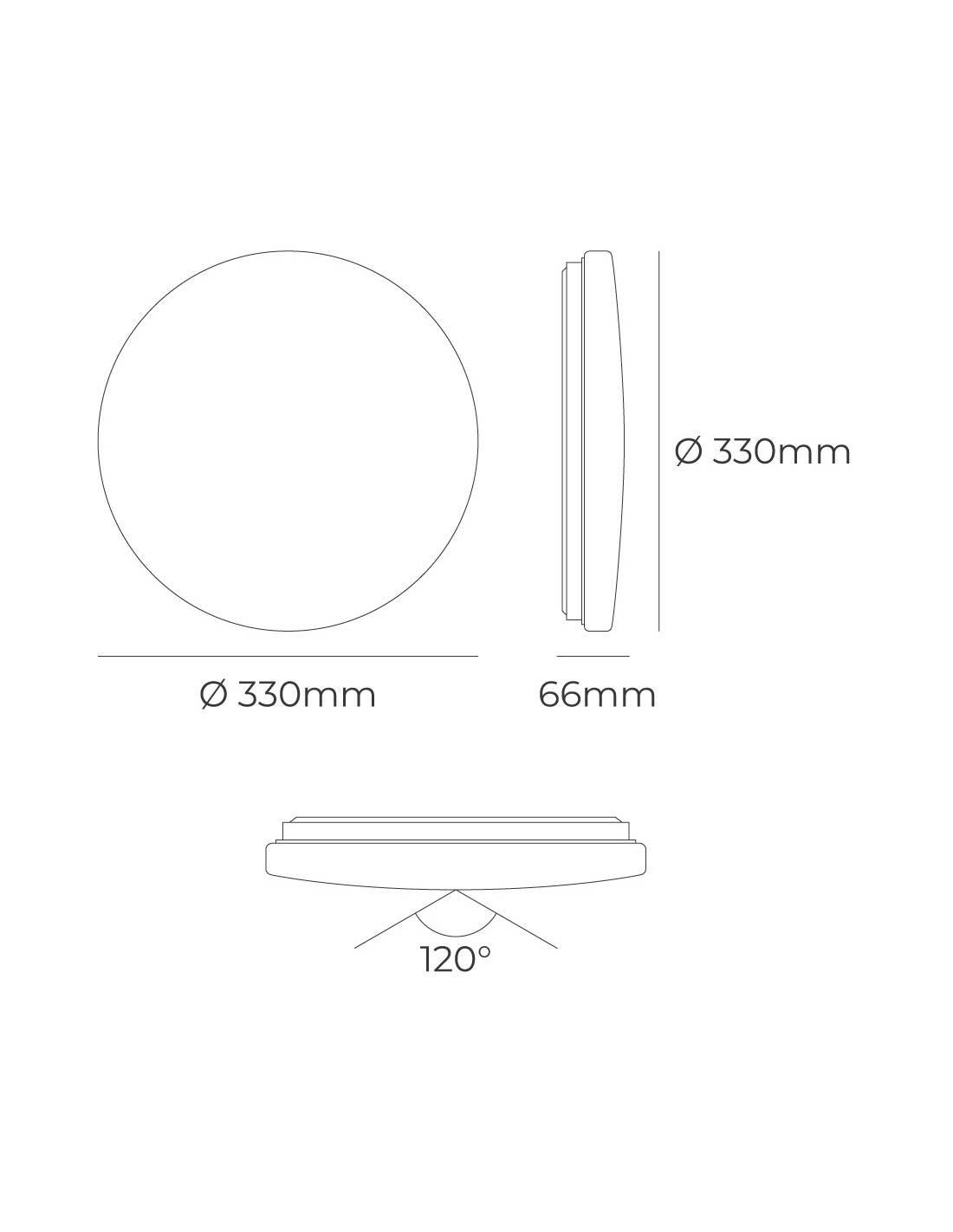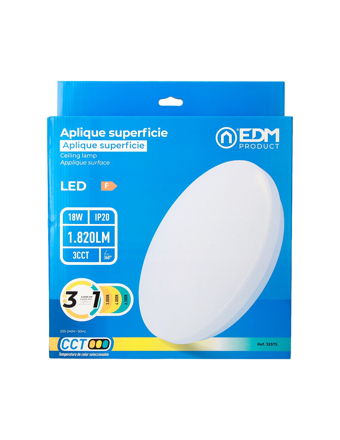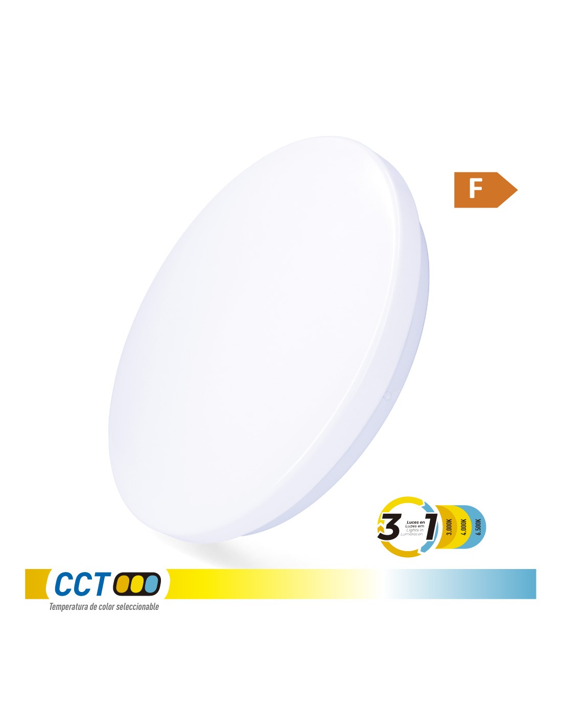 Aplique led circular de superficie 18 w 3cct (3000k, 4000k, 6500k) 1820 lm, 36 leds, flujo luminoso: 360°, ángulo de apertura: 120°, 220-240 v ~ 50 hz, ip20. vida estimada: 25.000 h, clase energética: f. medidas: ø33 x 6,6 cm, incluye kit de montaje