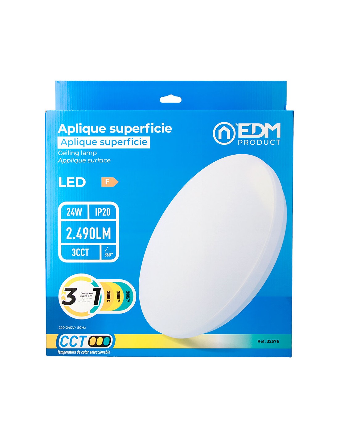 Aplique led circular de superficie 24 w 3cct (3000k, 4000k, 6500k) 2490 lm, 48 leds, flujo luminoso: 360°, ángulo de apertura: 120°, 220-240 v ~ 50 hz, ip20. vida estimada: 25.000 h, clase energética: f. medidas: ø38 x 6,6 cm, incluye kit de montaje