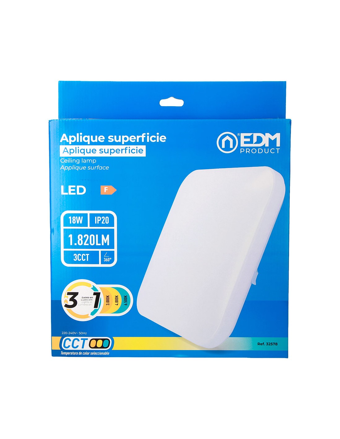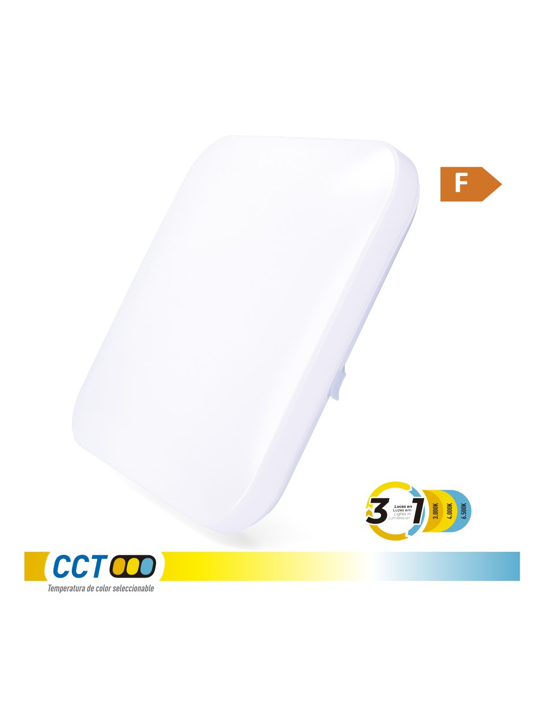 Aplique led cuadrado extraplano de superficie 18 w 3cct (3000k, 4000k, 6500k) 1820 lm, 48 leds, flujo luminoso: 360°, ángulo de apertura: 120°, 220-240 v ~ 50 hz, ip20. vida estimada: 25.000 h, clase energética: f. medidas: 33 x 33 x 7 cm, incluye kit de montaje
