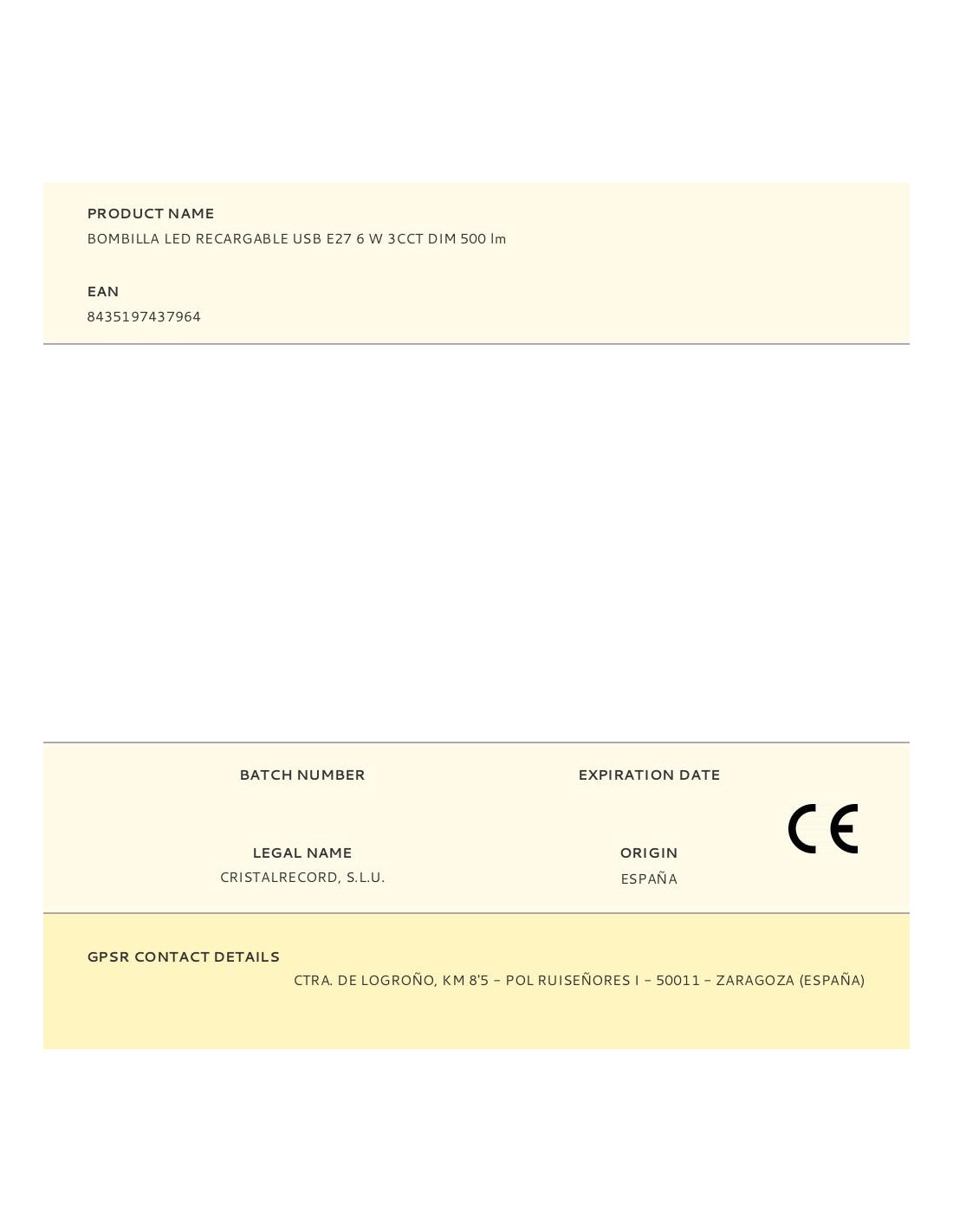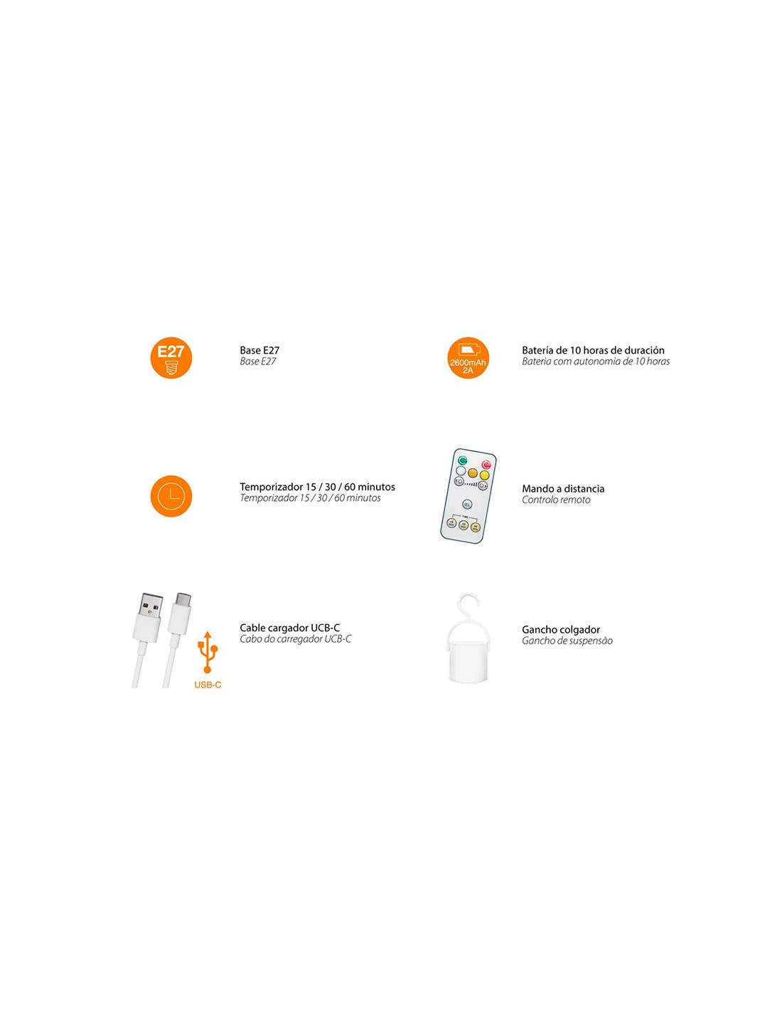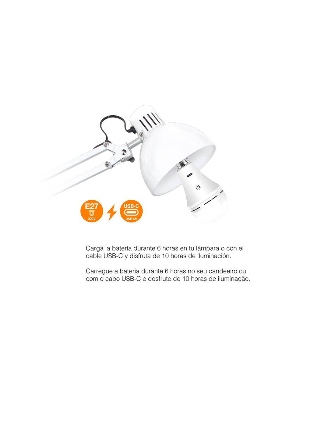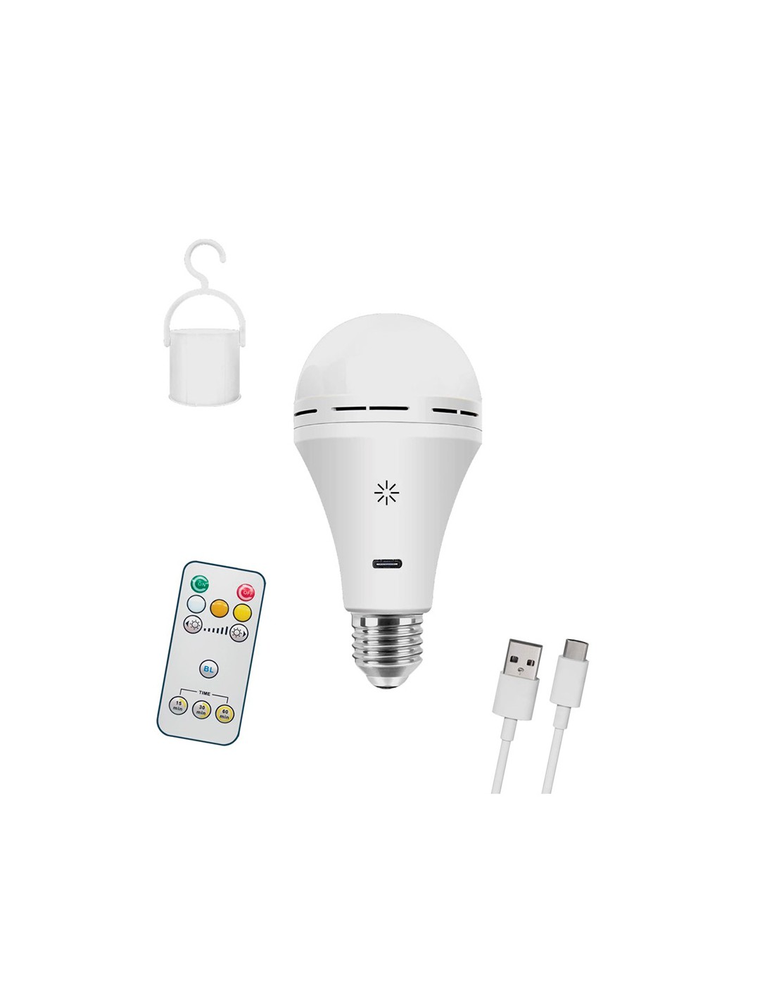Bombilla led recargable usb e27 6 w cct 3000-4000-6000k dim 500 lm, irc/cri 80 recargable con cable usb con mando a distancia, incluye accesorio para colgar duración de la batería 10 h según uso abs-pc vida útil 30000 h 15000 ciclos 85-265v~50hz blanca 130 x 70 mm