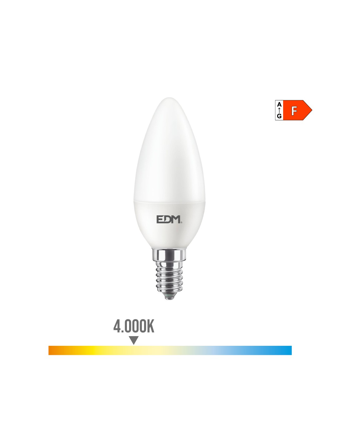 Bombilla vela led e14, 8 w, 806 lm, 4000 k, luz día. medida: ø3,8 x 11,4 cm vida estimada: 15.000 h ac 220 - 240 v ~50/60 hz clase energética f. ángulo de apertura: 240° tipo de flujo luminoso: 360° no regulable