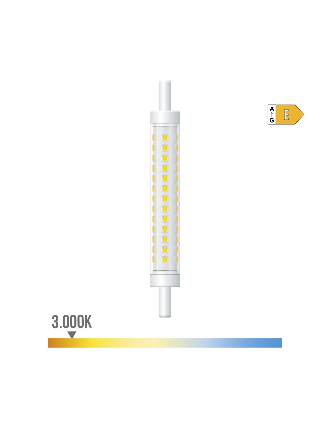 Bombilla lineal led r7s, 8 w, 900 lm, 3000 k, luz cálida, regulable, clase energética e, vida estimada 15.000 h, ángulo de apertura 300°, tipo flujo luminoso 360°, 220-240v~50/60 hz, ø15 x 118 mm