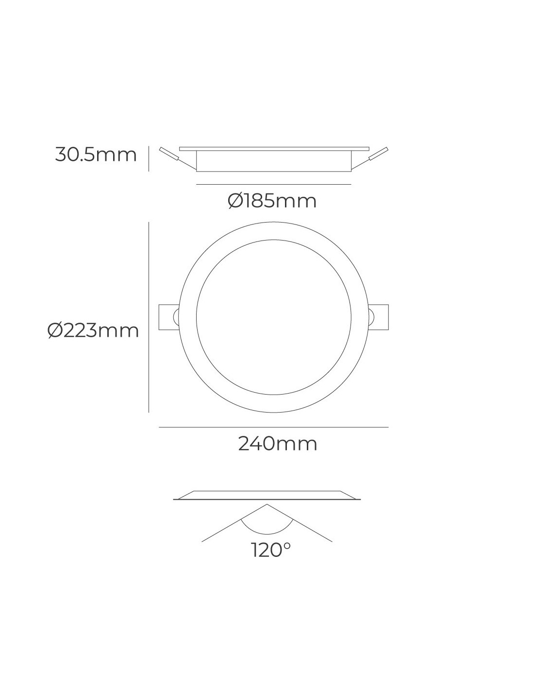 Downlight led empotrable, redondo, 18 w, 3cct, 1820 lm, 180 leds flujo luminoso: 360° medidas: exterior: ø22,3 cm - enclavamiento: ø18,5 cm marco blanco, ángulo de apertura: 120° 220 - 240 v~50 hz, ra80, ip20, vida estimada: 25.000 h clase energética: f. temperatura de luz variable mediante selector: 3000 k / 4000 k / 6500 k. la temperatura del color se debe escoger antes de la instalación. ø223 x 30,5 mm