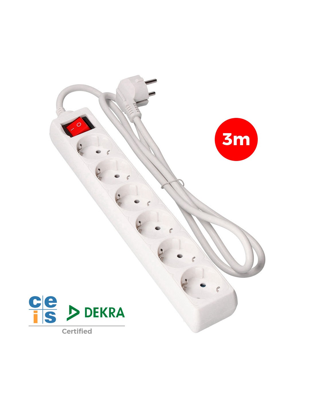 Base múltiple con 6 tomas schuko 2p+t, 16a 250v~, máximo 3680w, con interruptor luminoso, 3 m de cable h05vv-f 3g1,5 mm, blanca