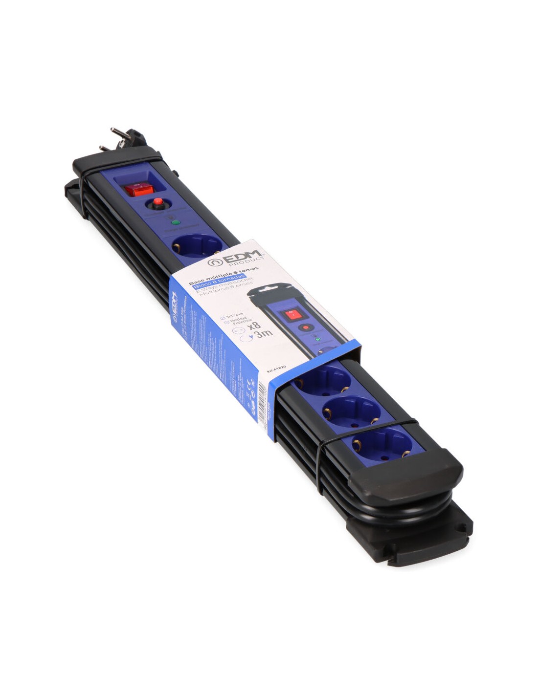 Base multiple 8 tomas schuko con protector + interruptor, 3 m cable h05vv-f 3g1,5 mm, 16a 230v~ 3680w, con proteccion para sobretensiones, recubrimiento antichoc, negra/azul