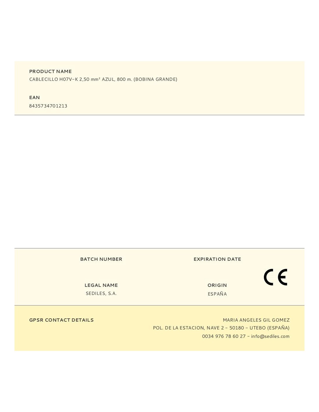 Cablecillo h07v-k 2,50 mm azul, 800 m. bobina grande 400 x 200 mm