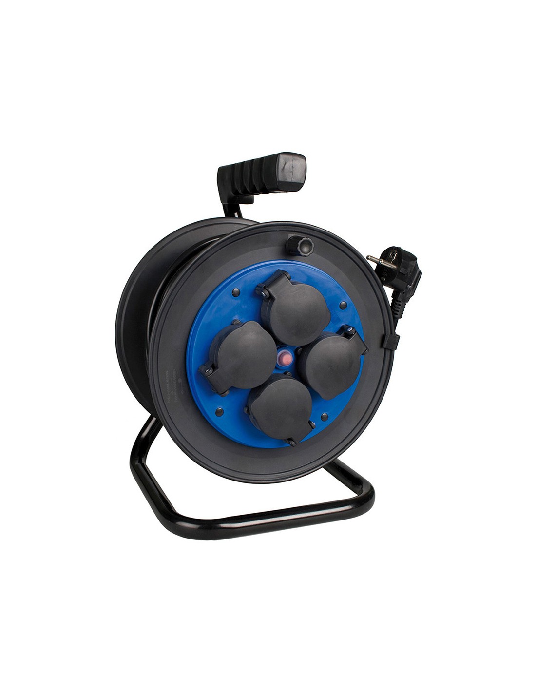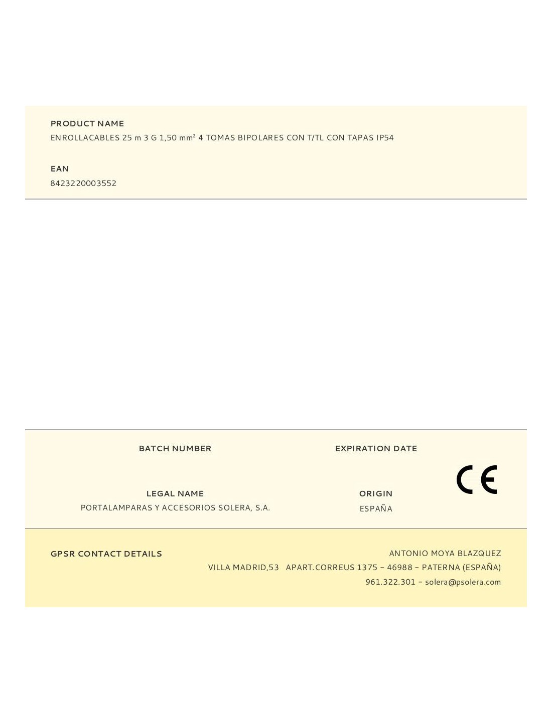 Enrollacable 25m 3x1,5mm con 4 tomas bipolares con t/tl con tapas solera. potencia maxima admisible extendido 3500w, potencia maxima admisible enrollado 1200w. 2p 16 a 250 v. tipo de cable h05vv-f 3x1,5mm. con limitador de potencia. ip54 7425/1t