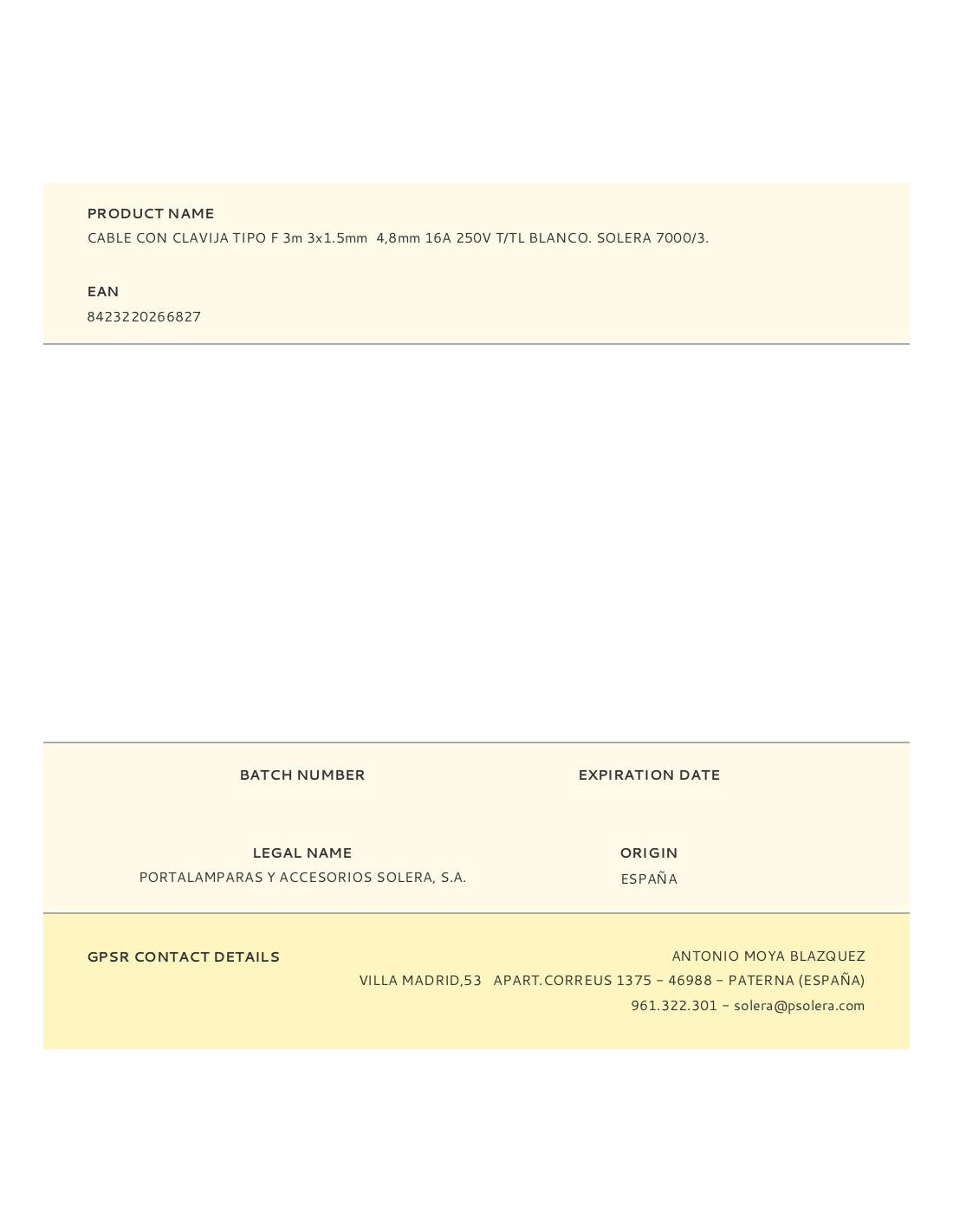 Cable con clavija tipo f 3m 3x1,5mm 4,8mm 16a 250v t/tl blanco. solera 7000/3. para aparatos de clase i. clavija inyectada con salida de cable a 90°. con doble sistema de tierra.