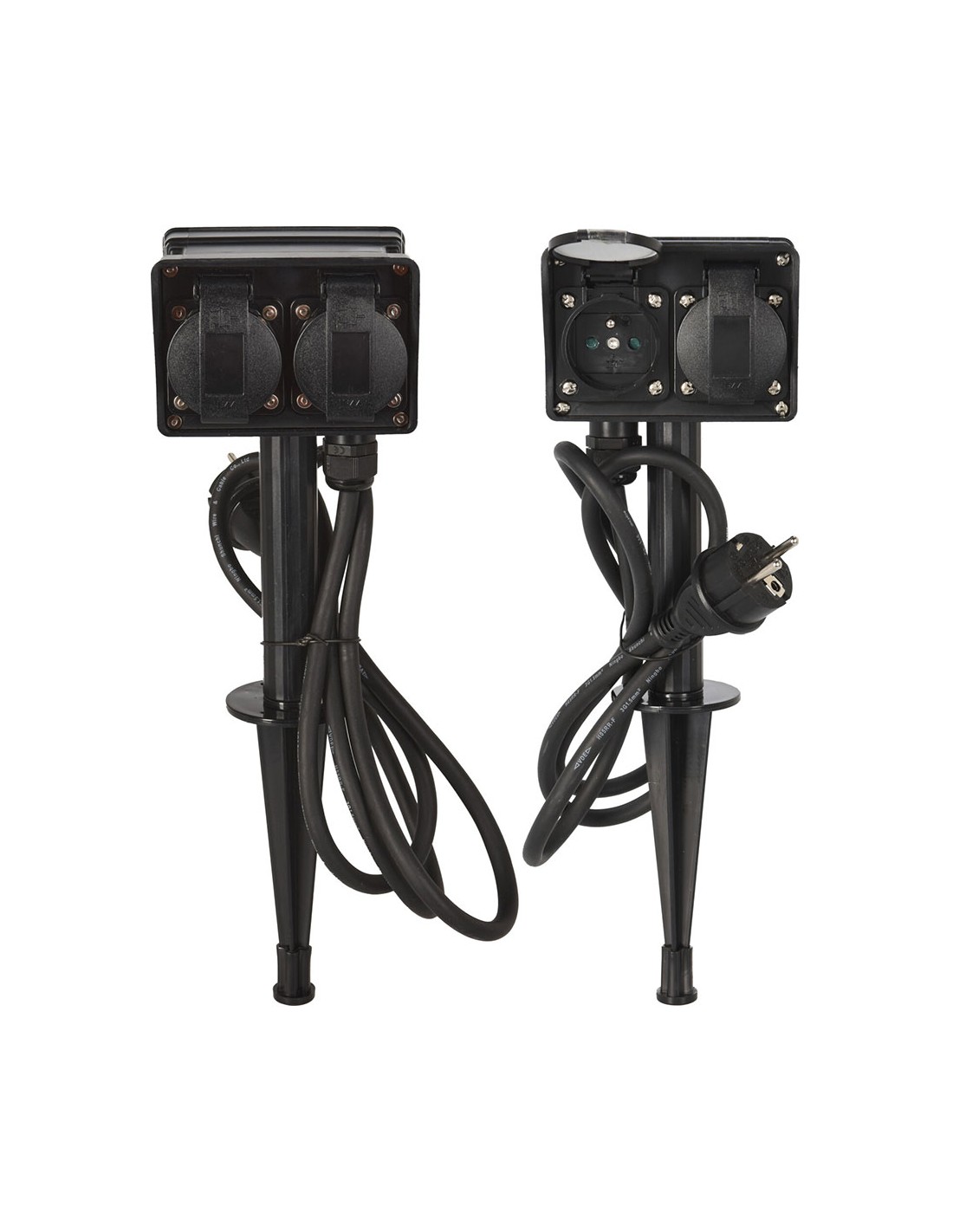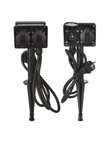 Base múltiple, 2 uds, 2 tomas schuko estaca jardin, con tapas, ip44 negra