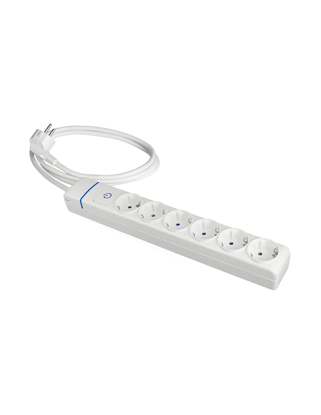 Base múltiple con 6 tomas schuko 2p+t, con interruptor luminoso azul, 1,5 m cable h05vv-f 3g1,5 mm, máx 3680w, 850 °c, ip20 embornamiento fácil acceso, tapa extracción rápida , agujeros de fijación a la pared/tubo fabricado en policarbonato serie ion blanca/azul