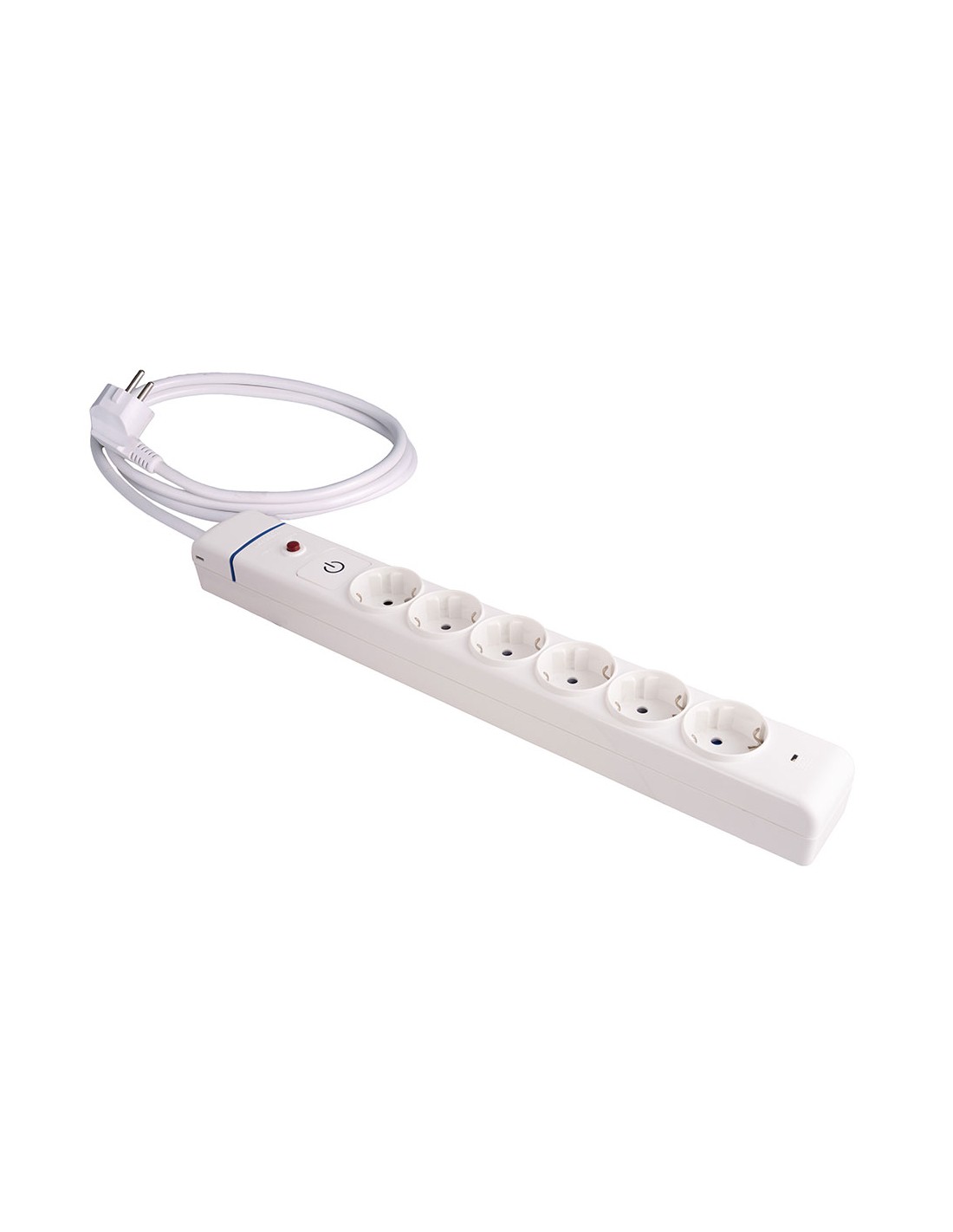 Base múltiple, 6 tomas schuko, con interruptor luminoso azul, con protección para sobretensiones y sobrecarga 1,5 m cable h05vv-f 3g1,5 mm, 16a 250v~, máx 3680w 850°c gwt, ip20, con agujeros para fijación por tornillos a la pared/tubo, fabricado en policarbonato, serie ion blanca