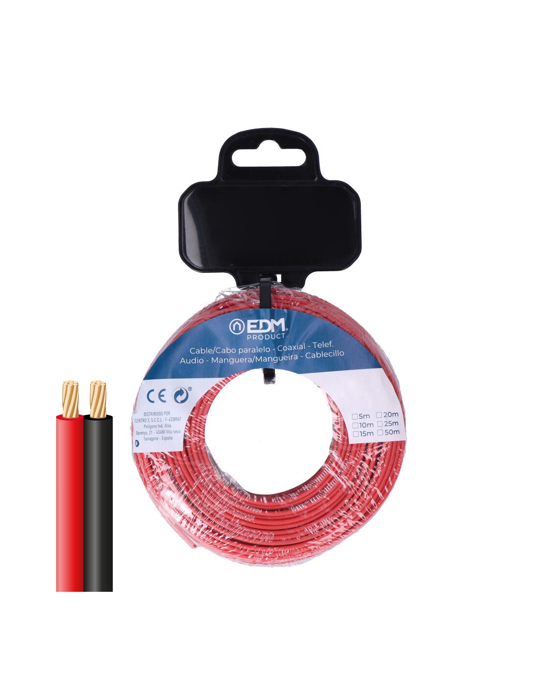 Cable paralelo 2x1mm rojo/negro, rollo 5m, tension nominal 48v, para la interconexión de audio, video y similares