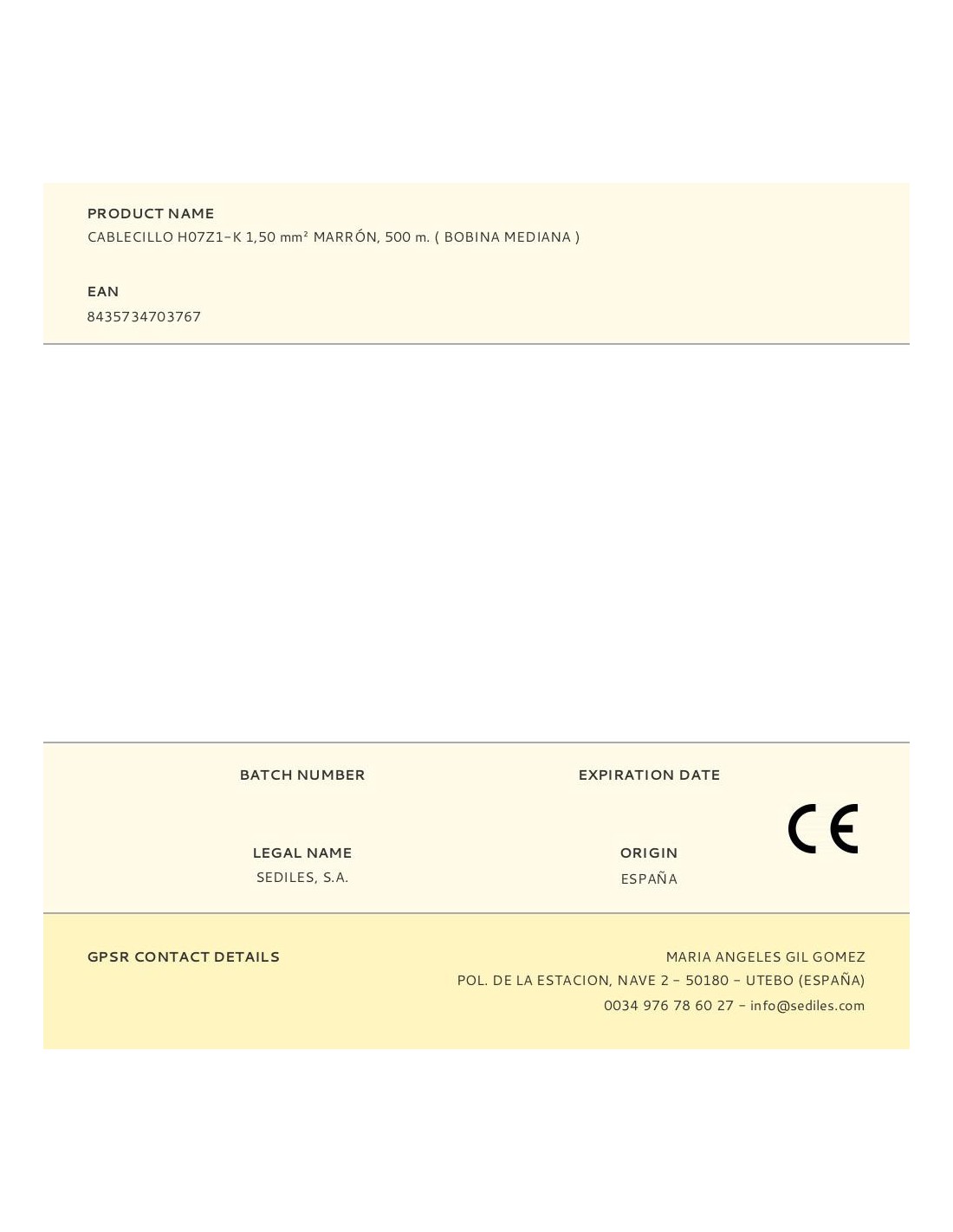 Cablecillo h07z1-k 1,50 mm marrón, 500 m. tensión nominal 450/750v, bobina mediana 260 x 150 mm