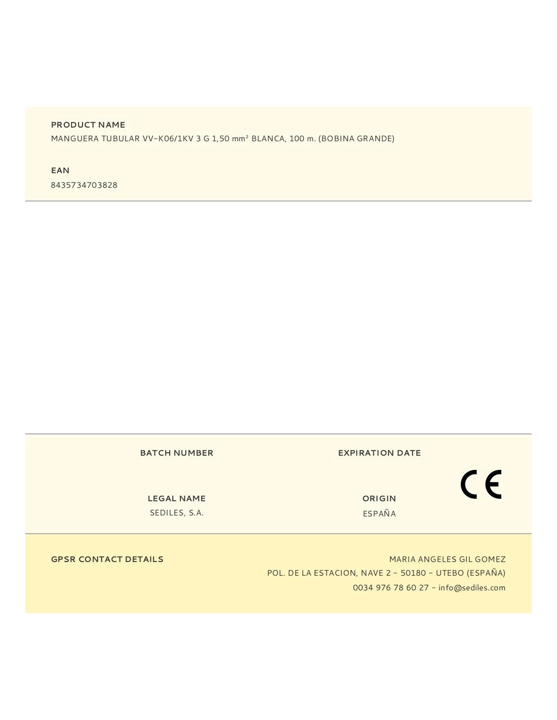 Manguera tubular vv-k06/1kv 3 g 1,50 mm blanca, 100 m. tensión nominal 600/1000v, bobina grande 400 x 200 mm