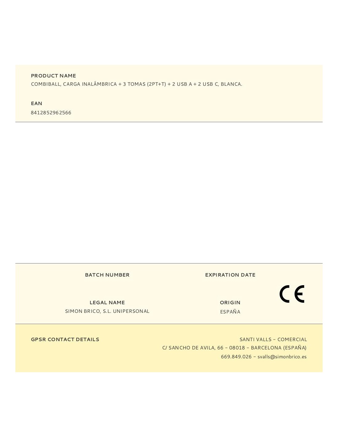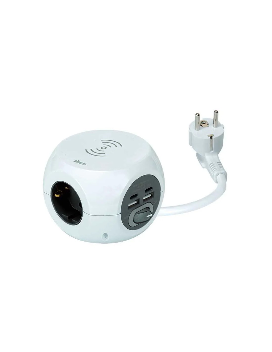Base múltiple combiball con carga inalámbrica + 3 tomas 2 pt+t schuko + 2 usb a + 2 usb c. cable 1,4 m 16a. 3.680 w max. blanca. 100 x 95 x 73 mm