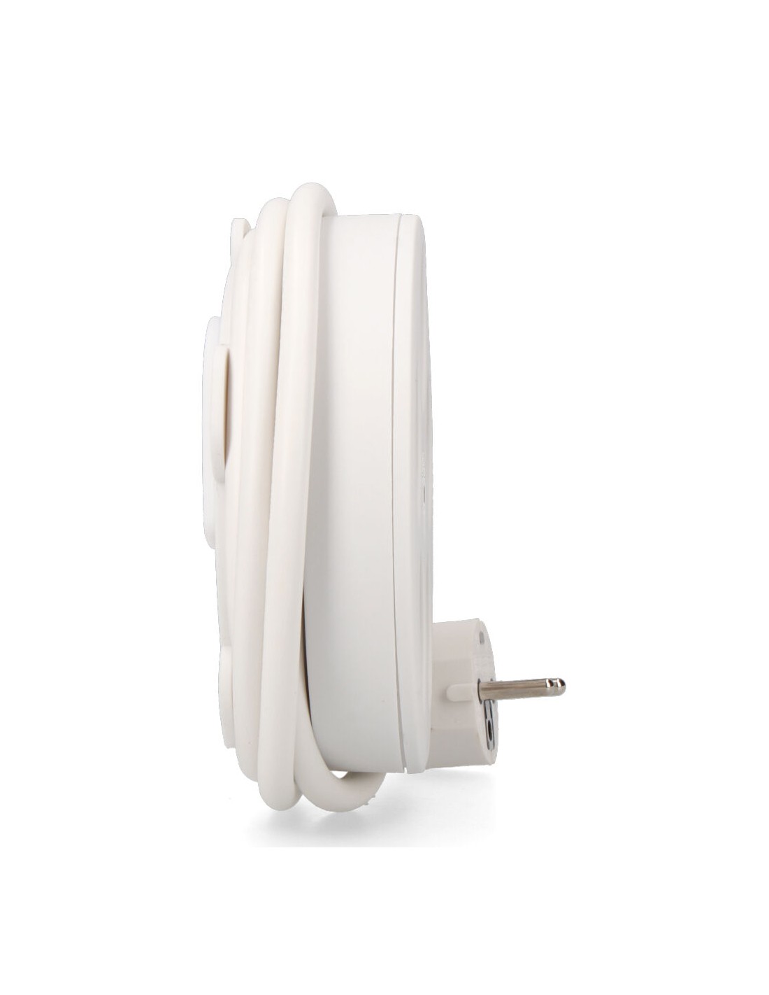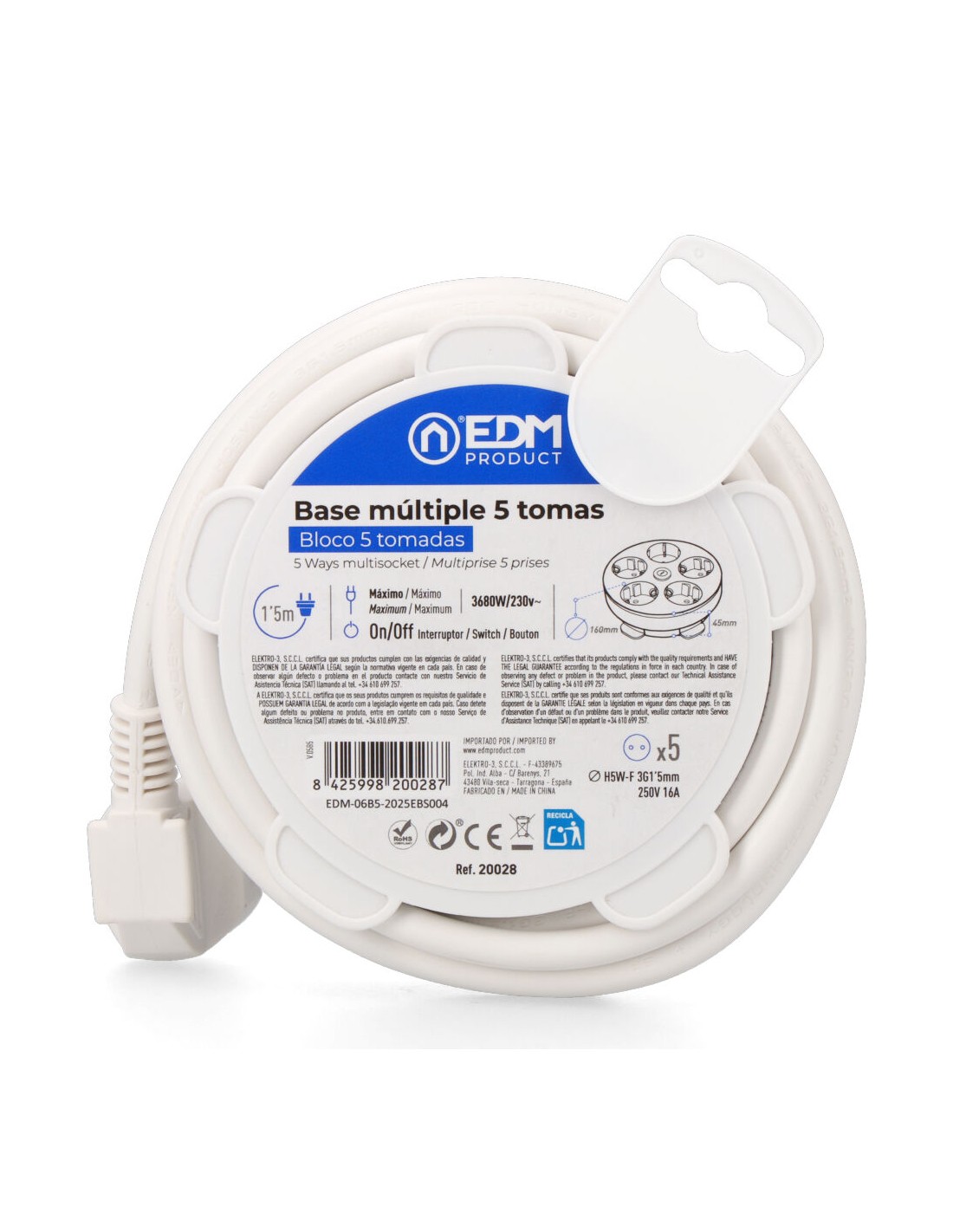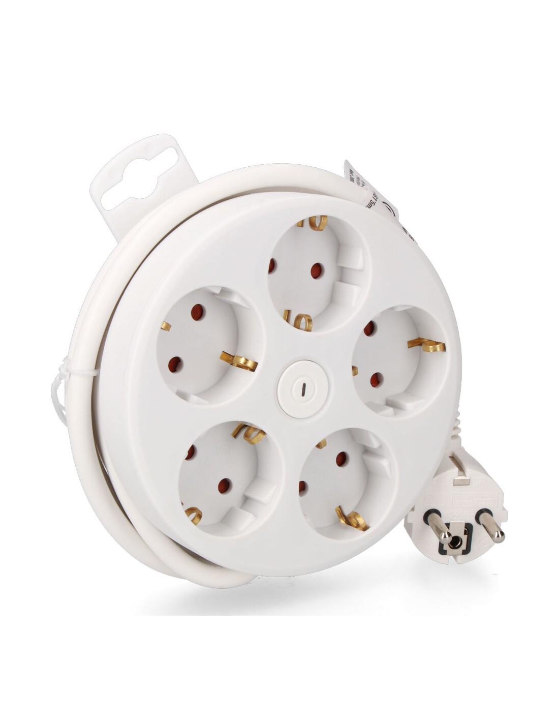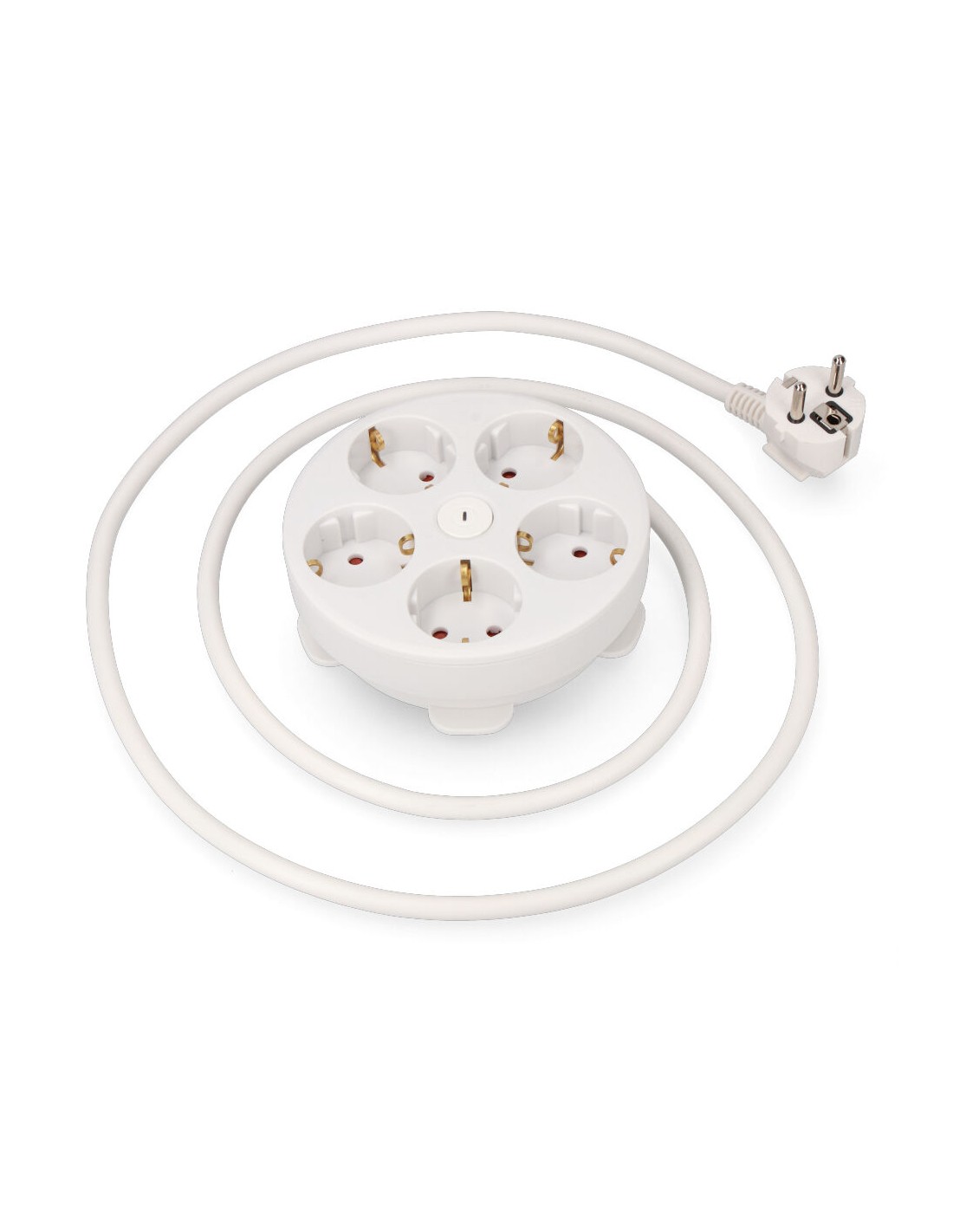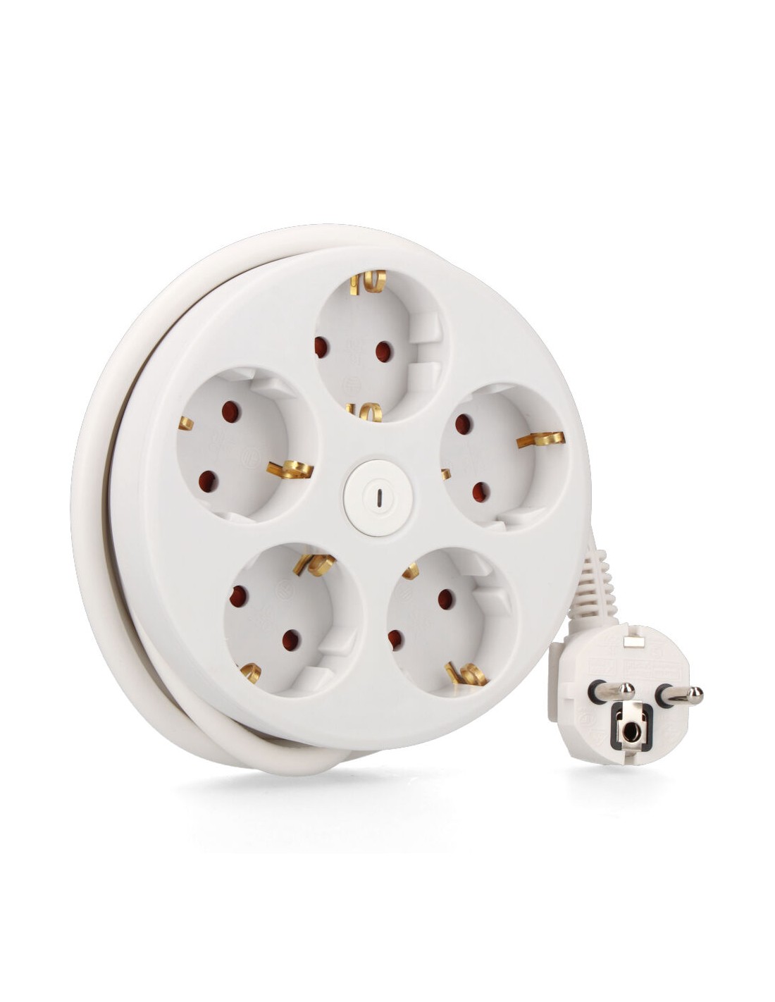 Base múltiple con 5 tomas 2p+t schuko, con interruptor, 1,5 m de cable h05vv-f 3g1,5 mm incluye ranura recoge cable máx. 3680w, blanca ø160 x 45 mm