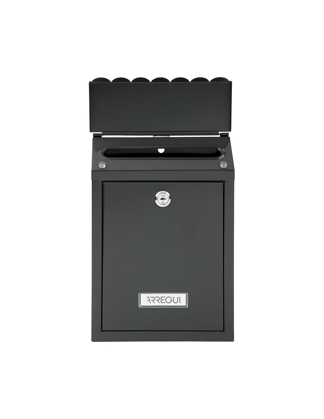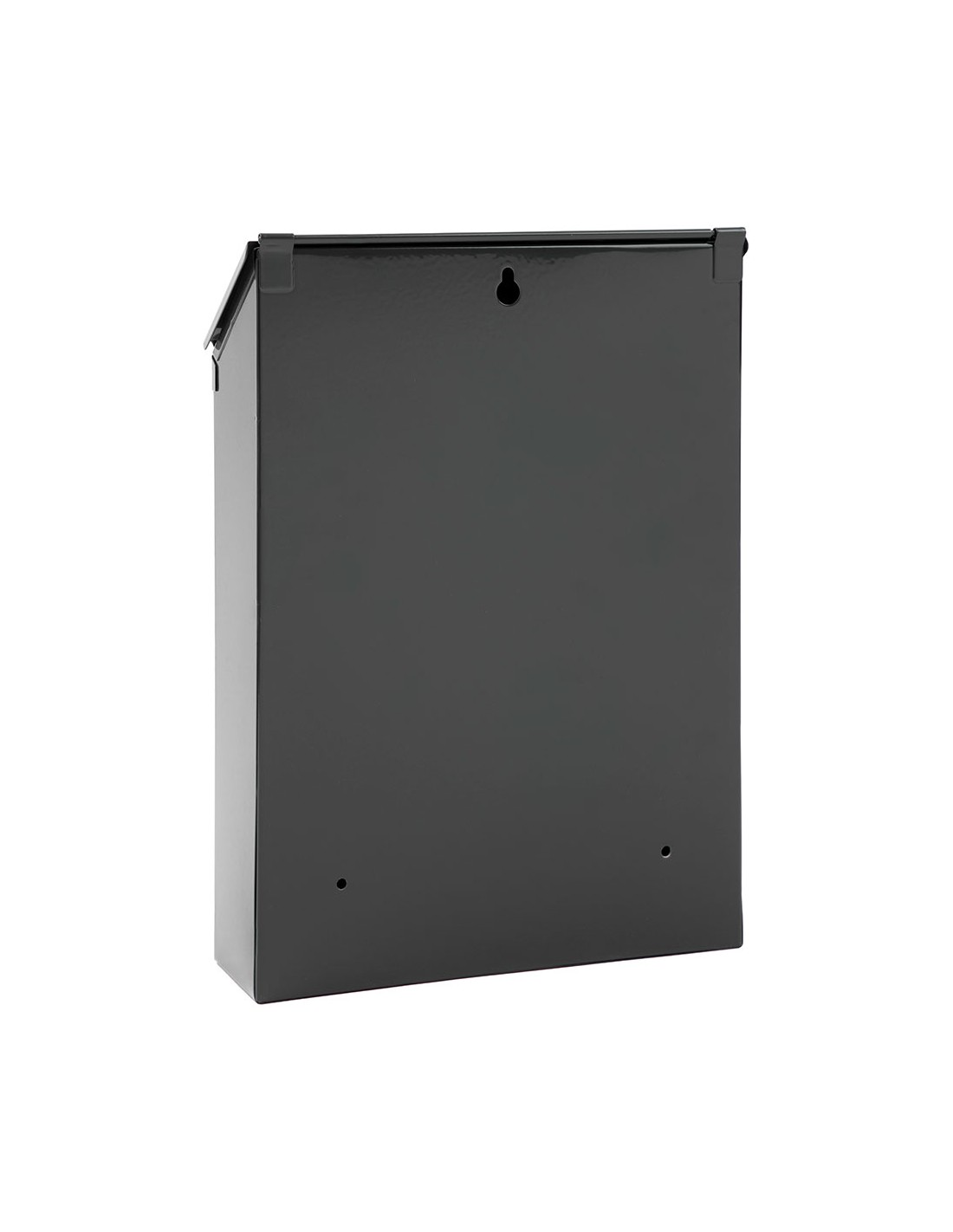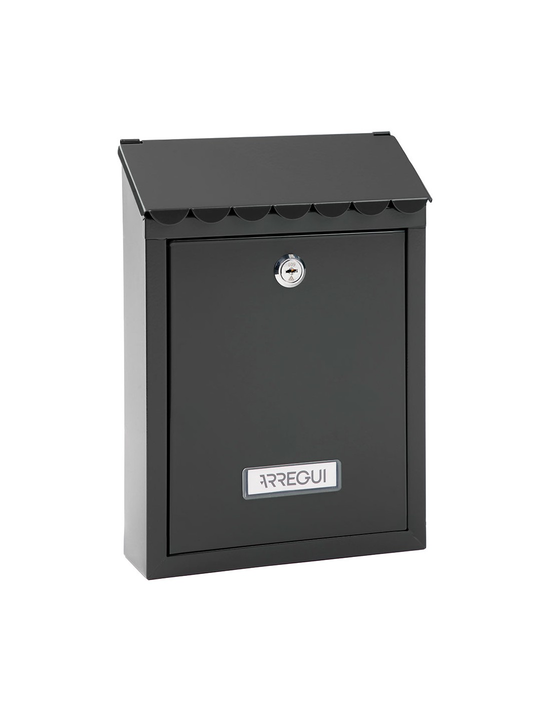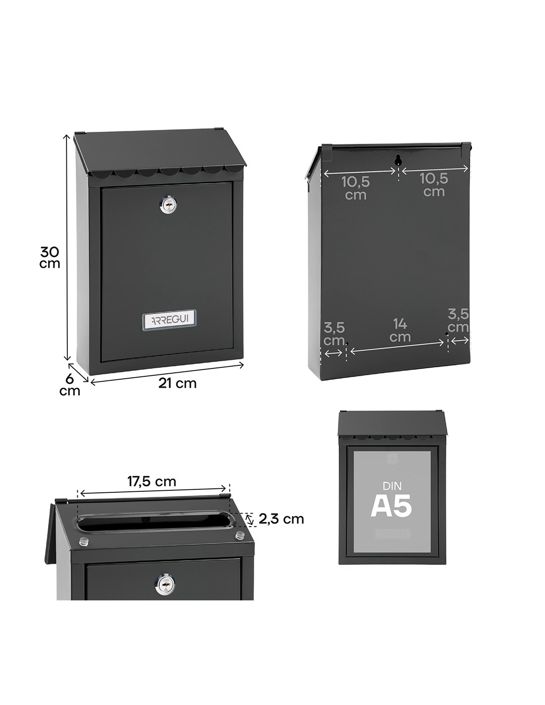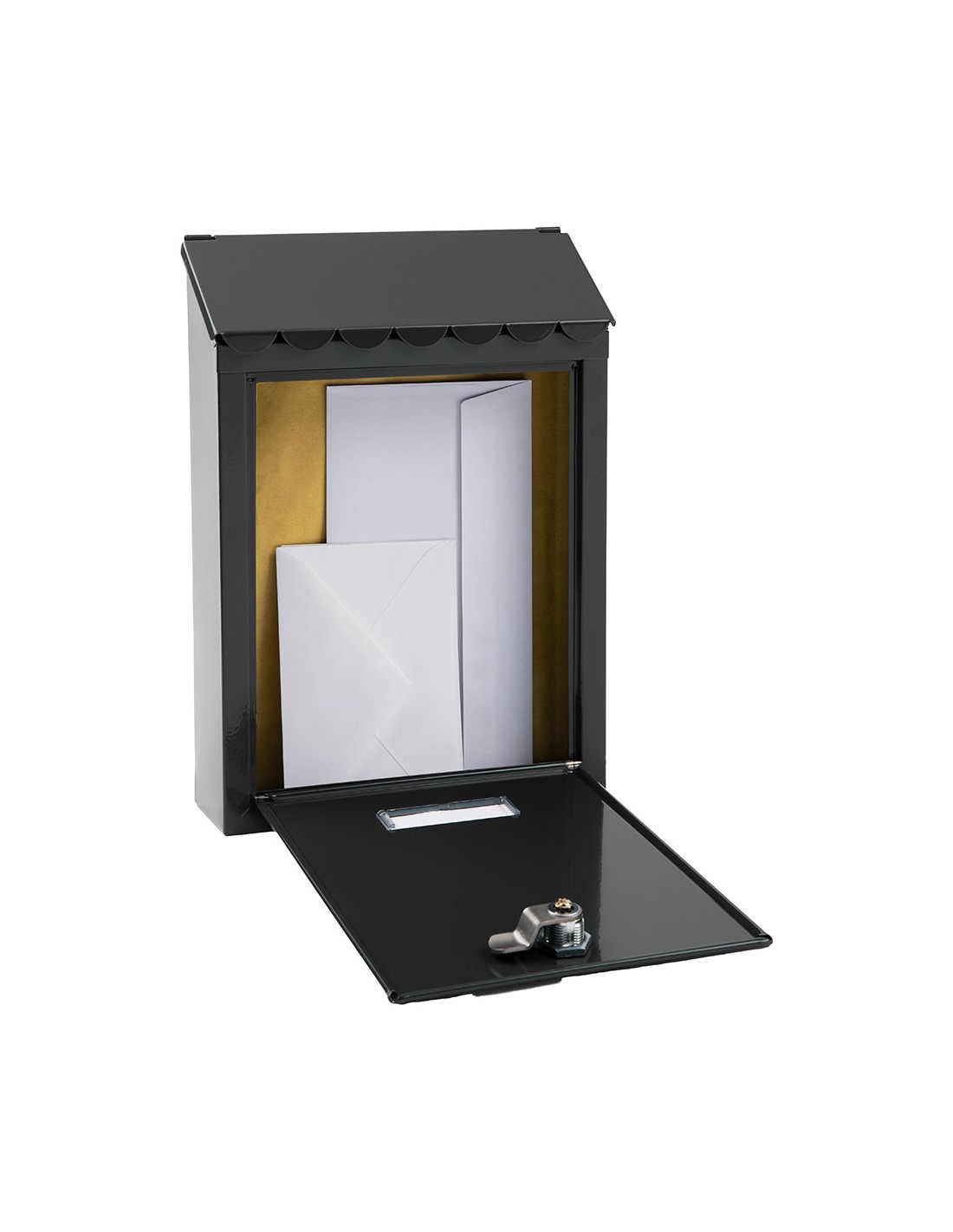Buzón individual para exterior tamaño s (a5), acero galvanizado lacado negro. tapa superior con forma de tejadillo que oculta la boca, la protege del agua de la lluvia apertura de puerta lateral incluye tarjetero, dos llaves y tornillos resistente a los rayos uv medidas: boca 17,5 x 2 cm, exterior 21,6 x 8 x 30 cm