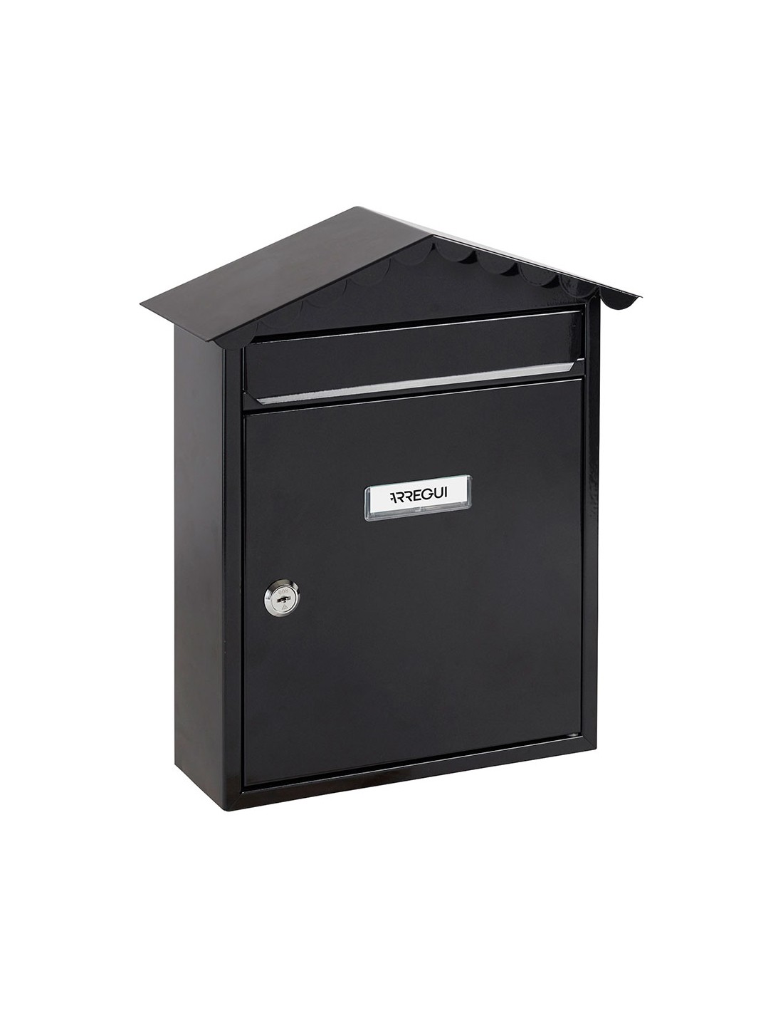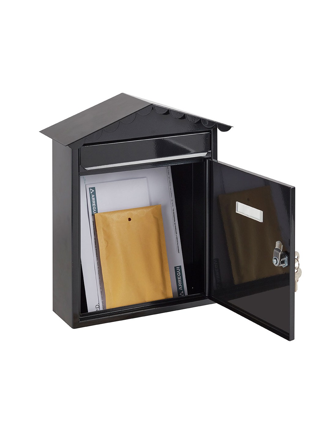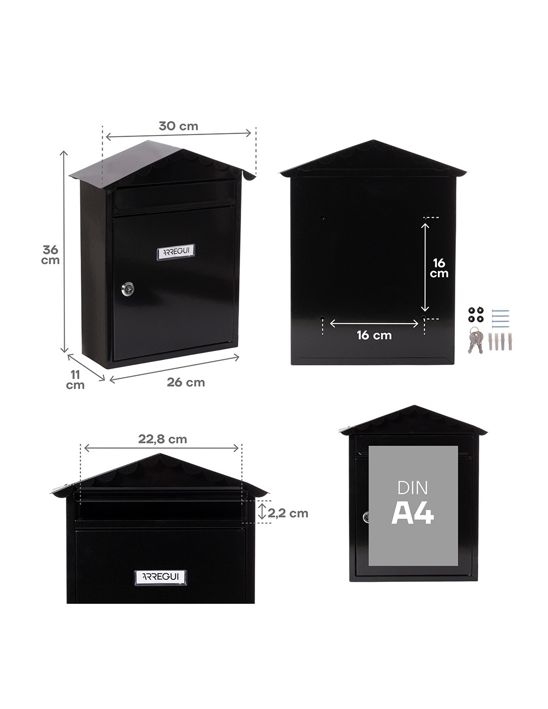 Buzón individual para exterior tamaño m (a4), fabricado en acero galvanizado lacado negro, con tejadillo decorativo que repele el agua de lluvia apertura puerta lateral incluye tarjetero, dos llaves y tornillos resistente a los rayos uv medidas: boca 22,8 x 2,2 cm, exterior 30 x 11 x 36 cm