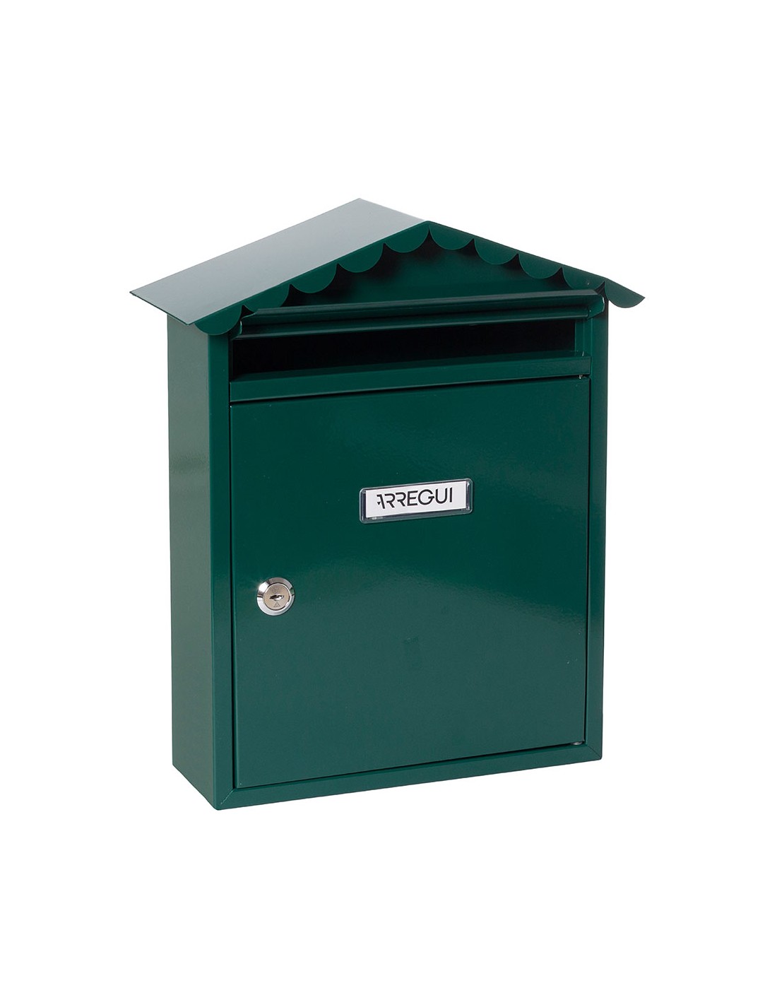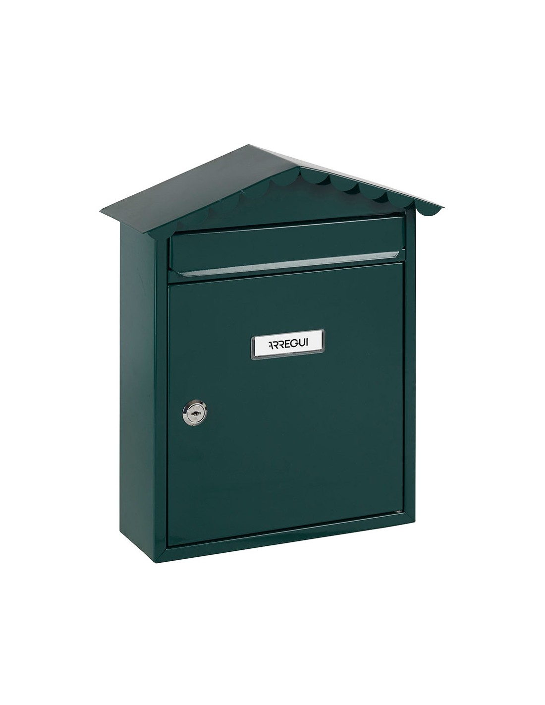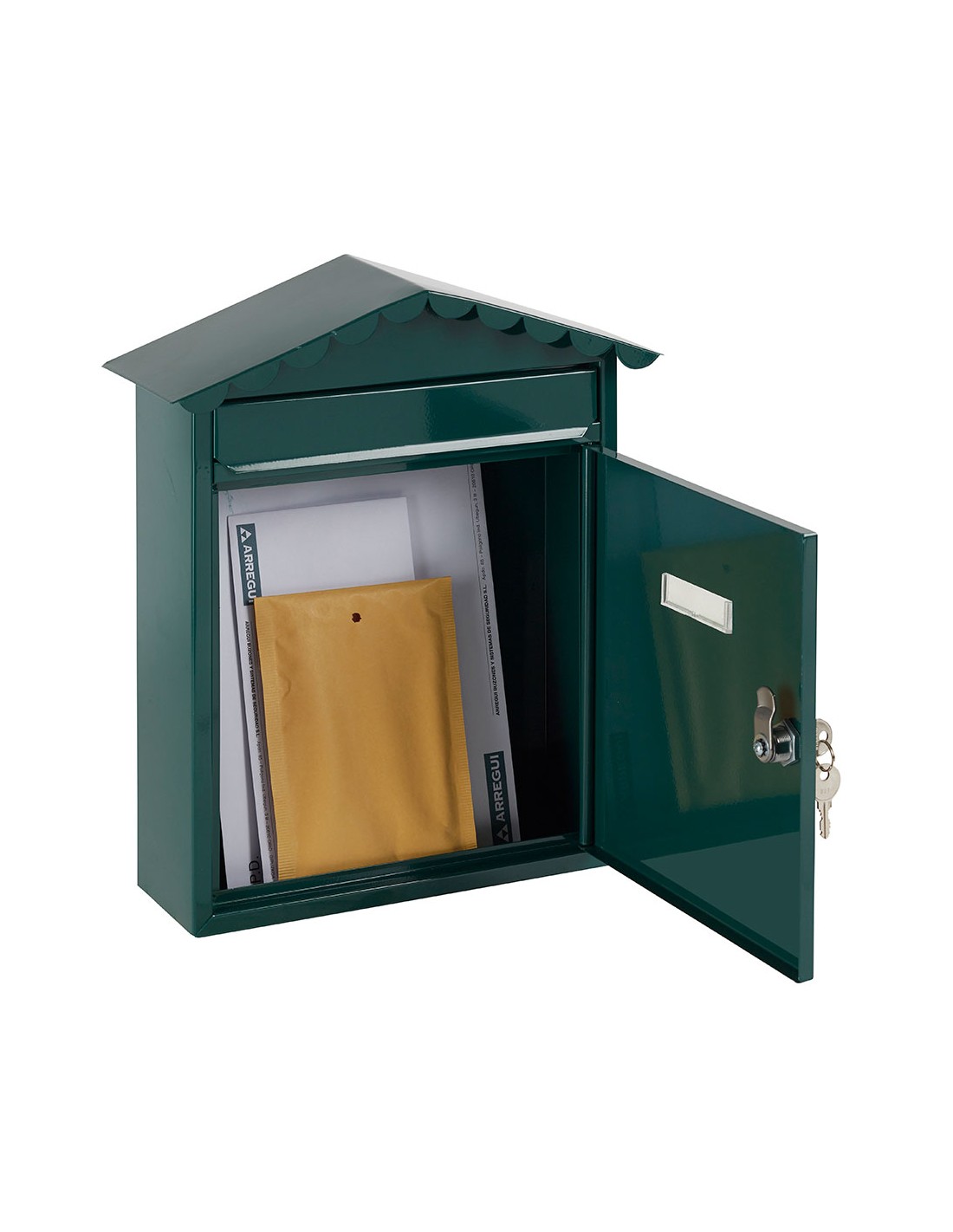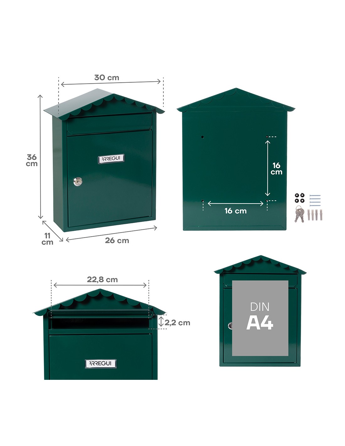 Buzón individual para exterior tamaño m (a4), acero galvanizado lacado verde, con tejadillo decorativo que repele el agua de lluvia apertura puerta lateral incluye tarjetero, dos llaves y tornillos resistente a los rayos uv medidas: boca 22,8 x 2,2 cm, exterior 30 x 11 x 36 cm