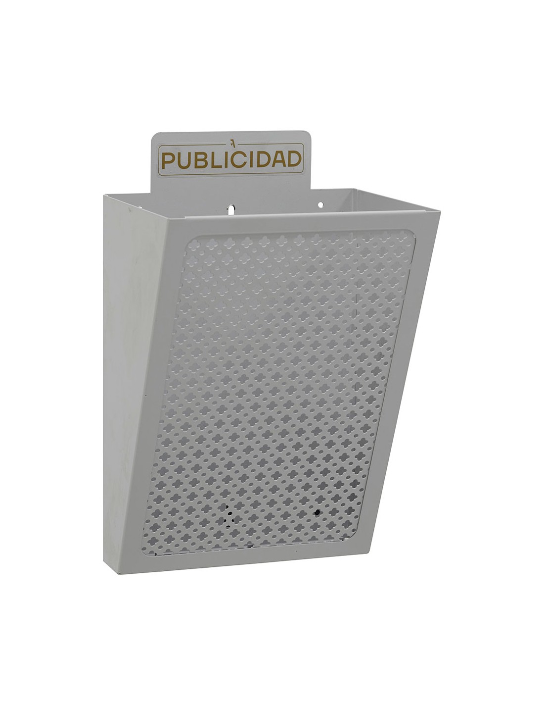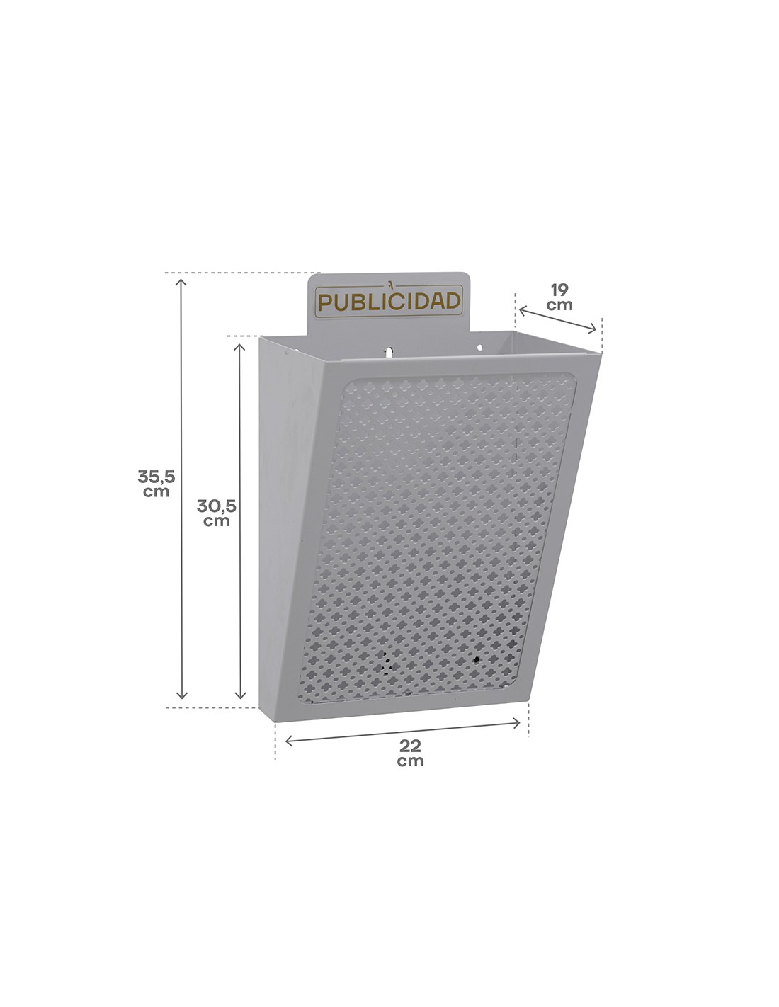 Cesta de publicidad modelo clásico, acero, plata, para colocar en la entrada de los edificios o en el exterior de los portales para recogida de publicidad en el exterior, rejilla frontal, total visibilidad interior, capacidad 7,5 l medidas: 22 x 19 x 35,5 cm