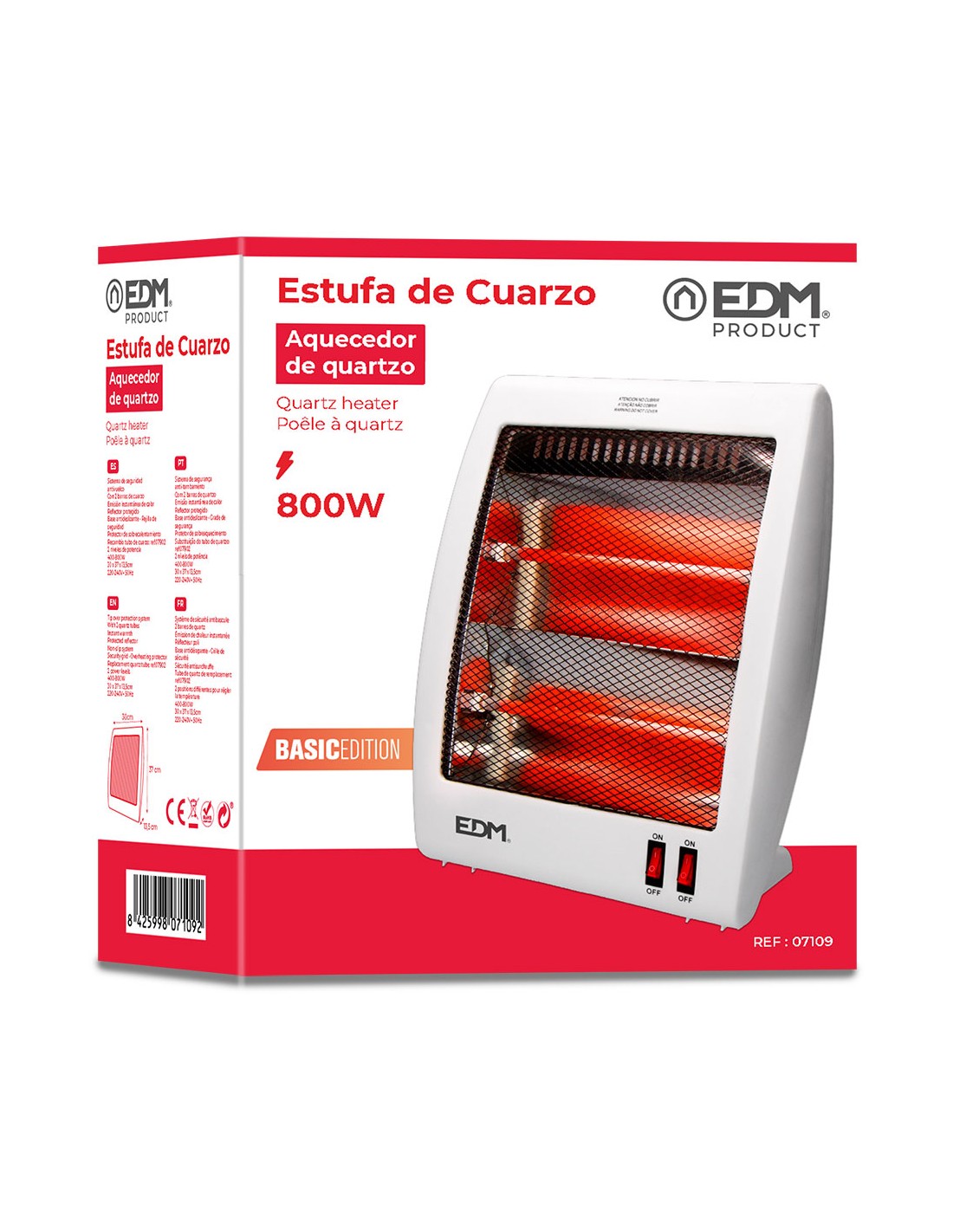Estufa con 2 barras de cuarzo y sistema de seguridad anti-vuelco. con 2 niveles de potencia: 400 y 800 w. 220-240 v - 50 hz. emisión instantanea de calor. incluye reflector protegido, base antideslizante, rejilla de seguridad y protector de sobrecalentamiento. recambio tubo: ref.07902 - dimensiones: 30 x 13,5 x 37 cm