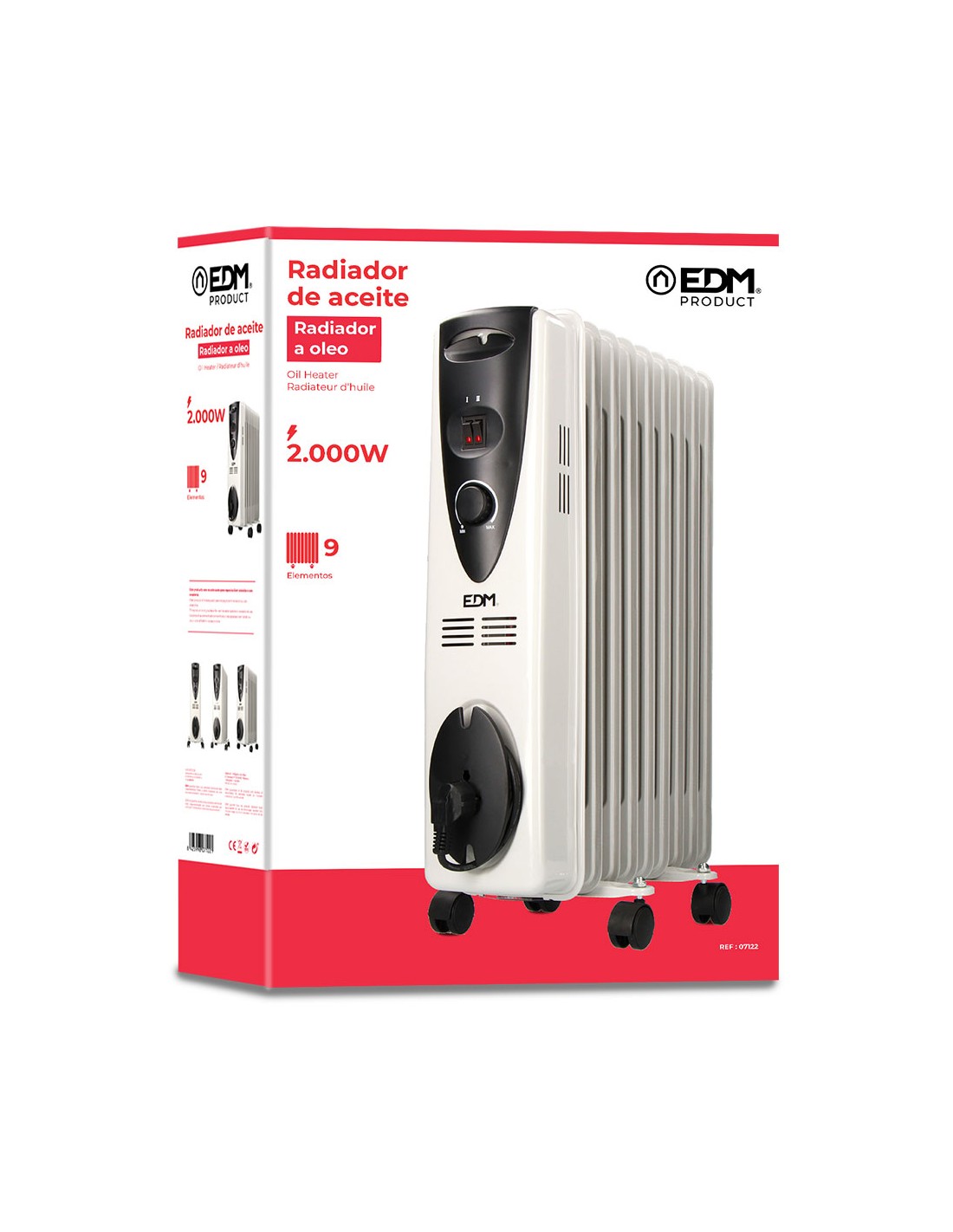 Radiador de aceite 2000 w con 9 elementos. 220 - 240 v 50 hz. incluye termostato y proteccion contra sobrecalentamiento. funcionamiento silencioso. fácil manejo mediante botones. dimensiones: 16,5 x 45,5 x 73 cm. se recomienda por el buen uso y mantenimiento, poner siempre de pie este radiador
