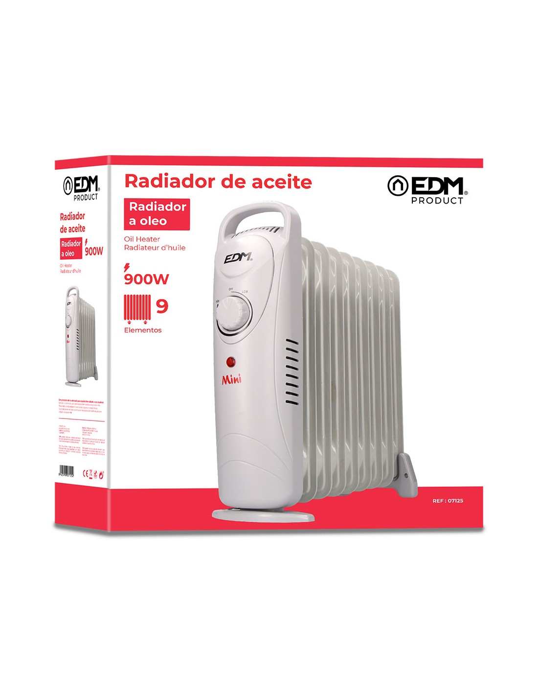 Radiador de aceite 900 w con 9 elementos modelo junior. . 220 - 240 v 50 hz. con termostato y proteccion contra sobrecalentamiento. funcionamiento silencioso. facil manejo mediante botones. dimensiones: 10 x 39 x 37 cm.. se recomienda por el buen uso y mantenimiento, poner siempre de pie este radiador