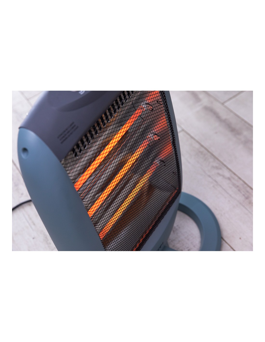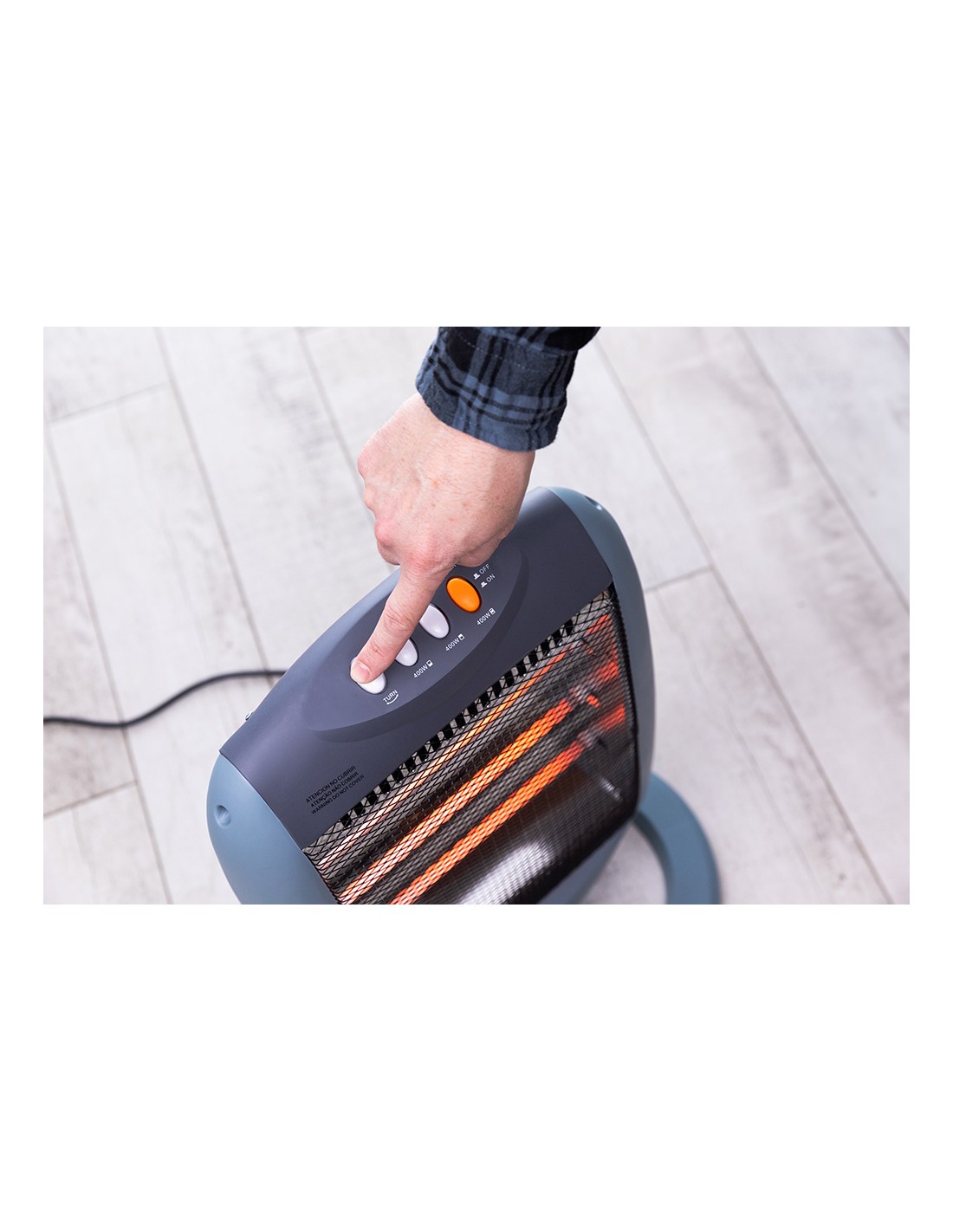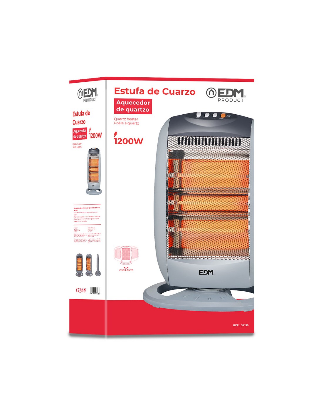Estufa de cuarzo oscilante con sistema de seguridad anti-vuelco. tiene 3 barras de cuarzo con emision instantanea de calor. 3 niveles de potencia: 400 / 800 / 1200 w, 220-240 v - 50 hz. incluye reflector protegido, base antideslizante. rejilla de seguridad y protector de sobrecalentamiento. dimensiones: 30 x 40 x 53 cm